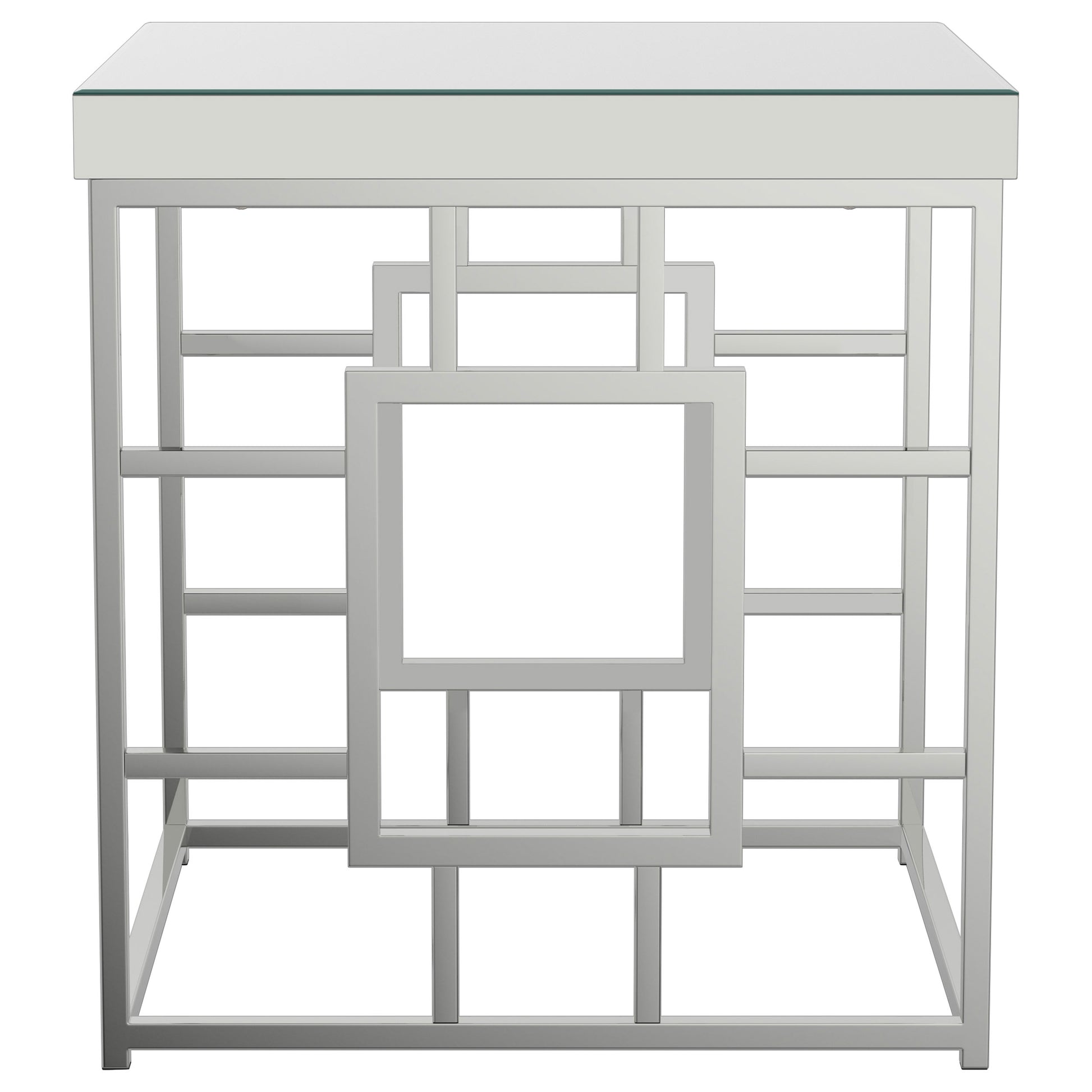 Accent your space with this modern end table. Showcase your flair for architecture with the geometric frame design. Brighten up any contemporary space with the mirrored tabletop. The metal frame is electroplated in a shiny chrome finish for the ultimate in sophistication. Piece pairs well with coffee table from same collection.