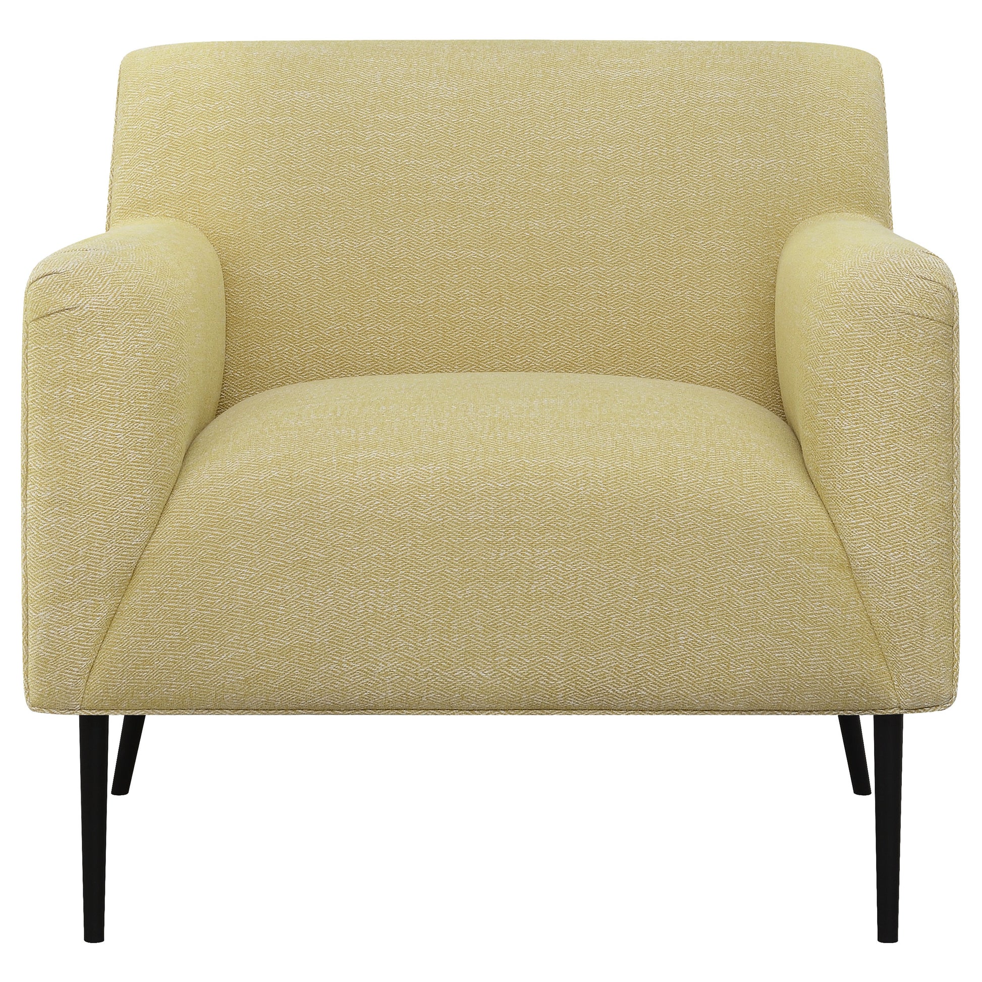 Upholstered in a beautiful, lemon polyester fabric, this contemporary accent chair is sure to catch the eye. The soft texture welcomes you to rest between soft track arms as you converse with friends or pick up a good book. Its cheerful, sunny disposition lends itself to vintage and coastal aesthetics effortlessly. Beneath, tapered black metal legs bring to mind mid-century modern vibes. Place this contemporary lemon accent chair in a bedroom or living room for a bold splash of color.