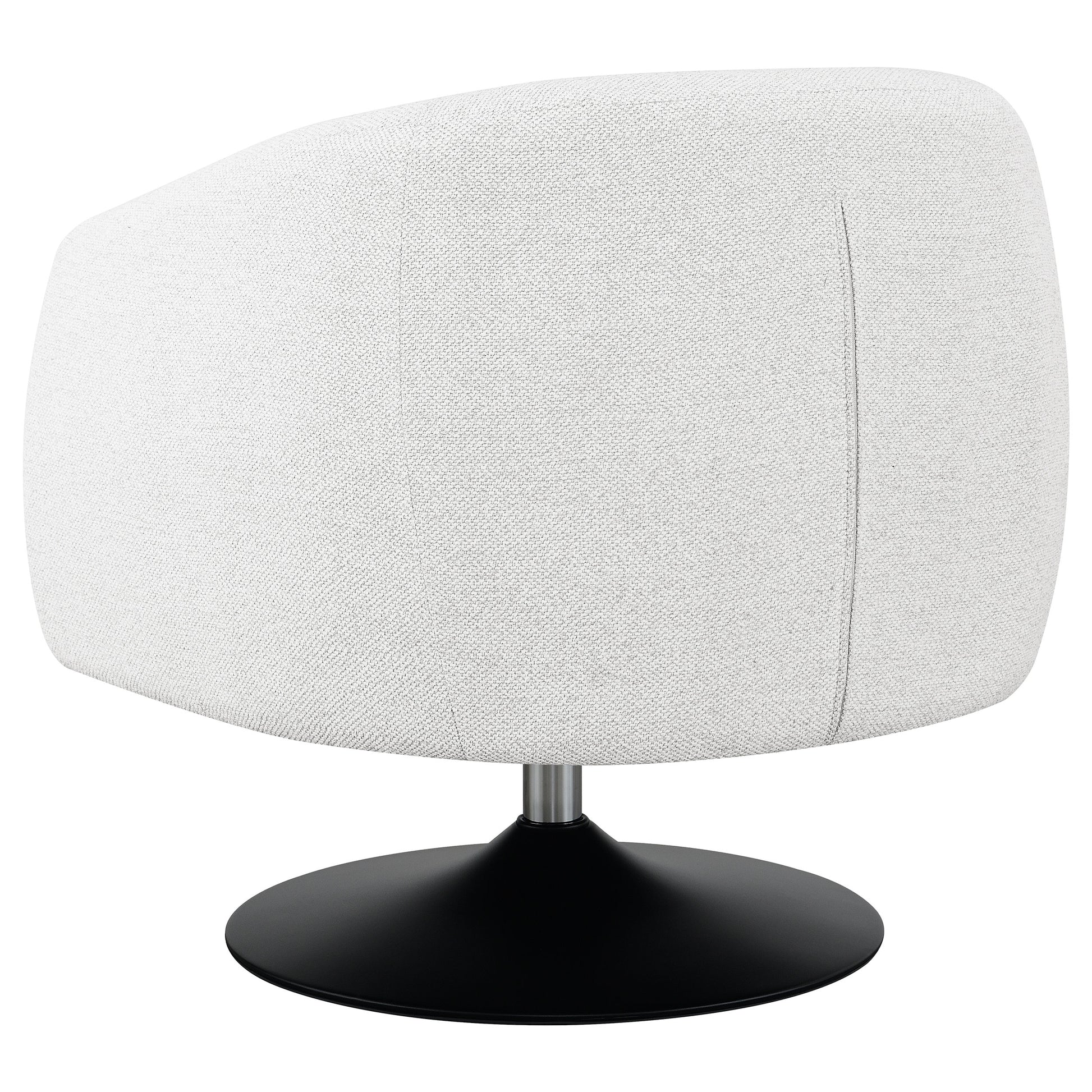 Wrapped in a beige boucle fabric, this contemporary swivel accent chair is the perfect addition to a vintage-inspired home. A throwback to a retro era, the chair offers a barrel style design situated on a pedestal base, swiveling 360 degrees. A wonderful addition to a conversational seating arrangement or open floor plan entertainment space, this chic swivel chair also offers a softly rounded back with subtle channel tufting and tapered off armrests. A waterfall-style, tailored seat cushion further lends to the clean lines of this clever, versatile accent chair. The matte black finish on the base also adds a striking contrast for a modern touch.