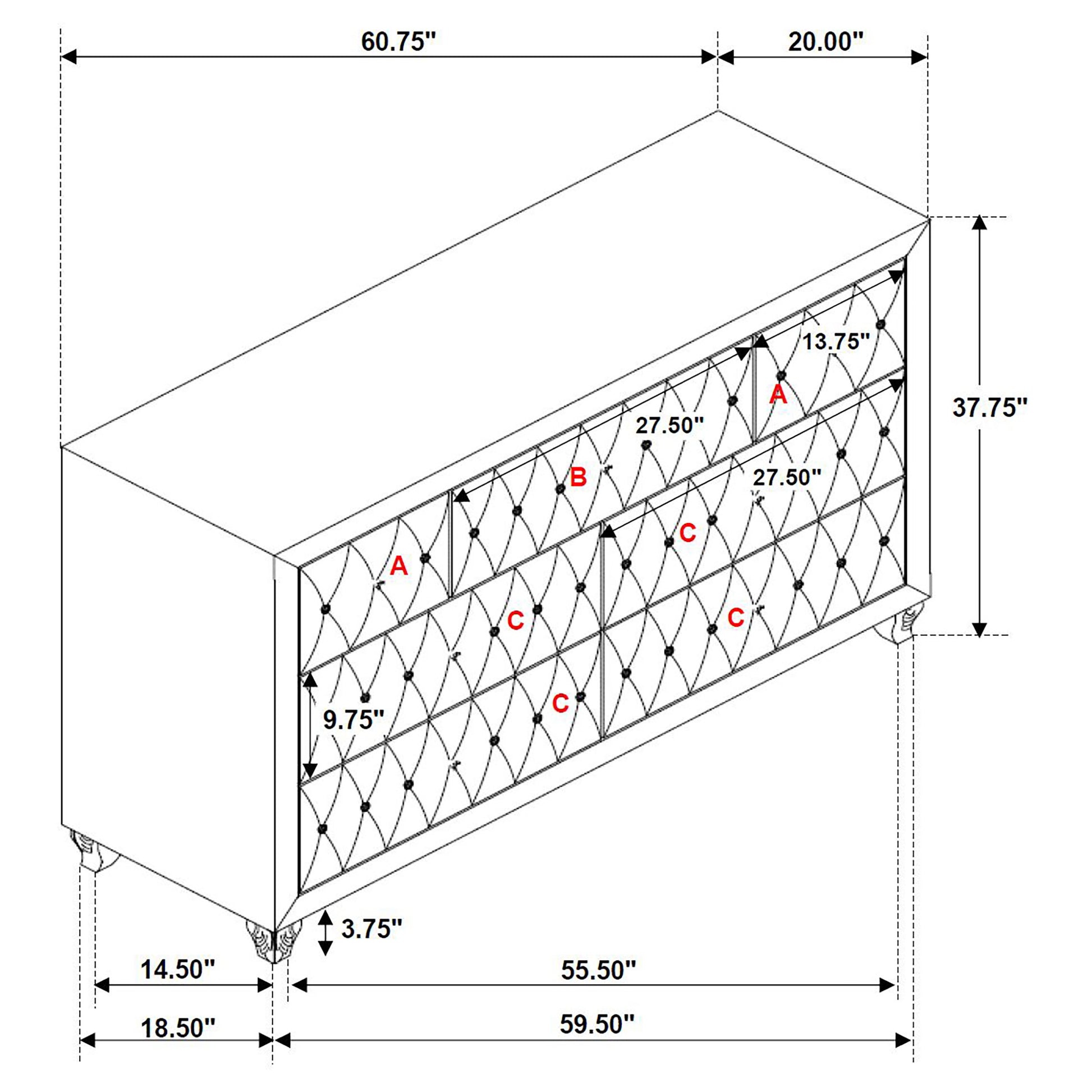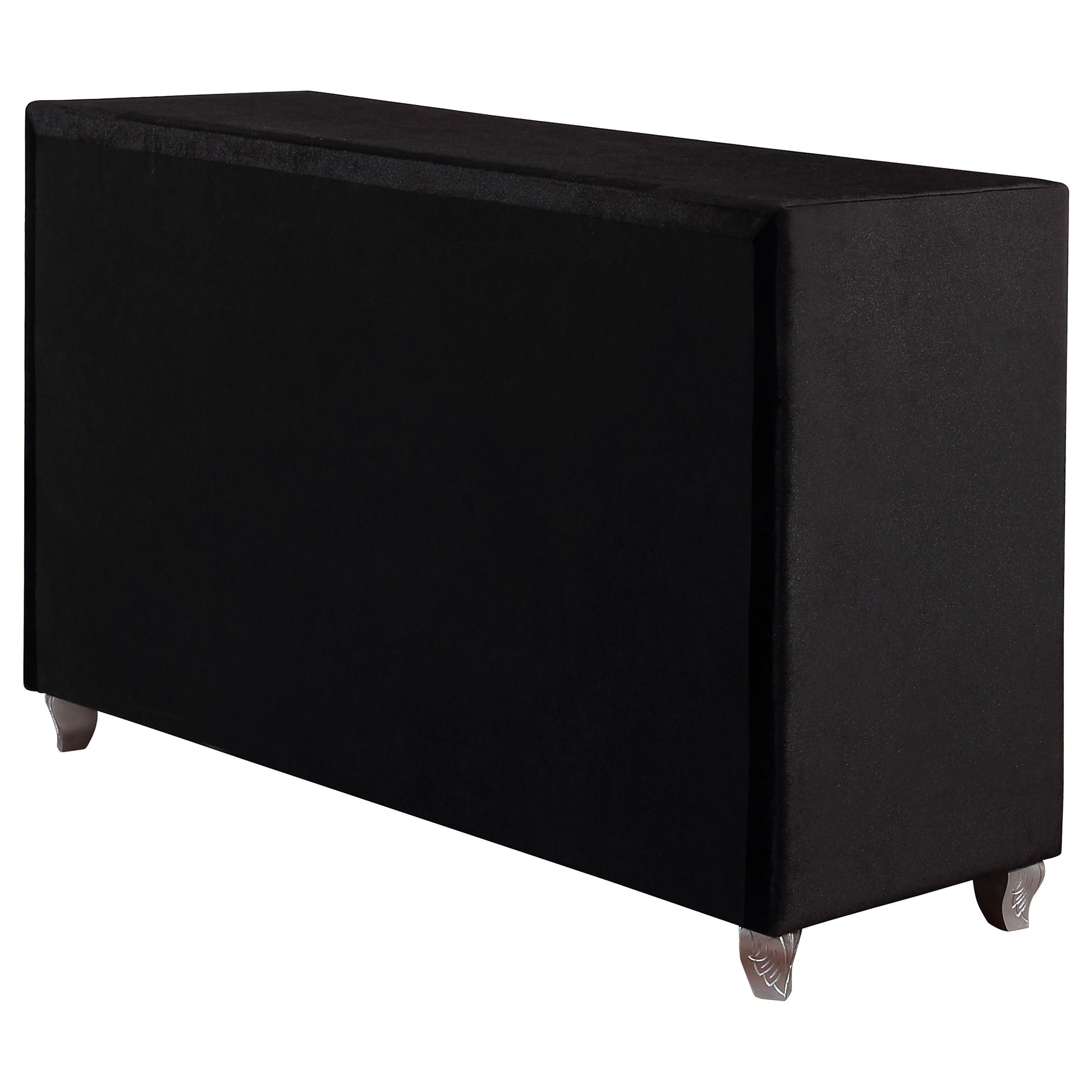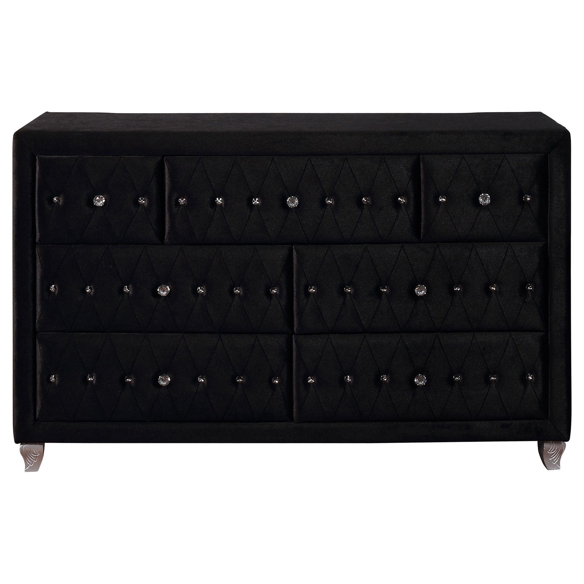 Add modern glamour to a young adult's bedroom with this seven-drawer black dresser. The ultimate luxury, soft velvet fabric adorns the sleek silhouette. Elevate the level of chic sophistication with radiant, curved legs in a metallic finish. Crystal drawer pulls and lines of crystal button diamond tufting adorn the drawers. Top with a mirrored vase full of fresh flowers or the latest magazines to complete the stylish look.