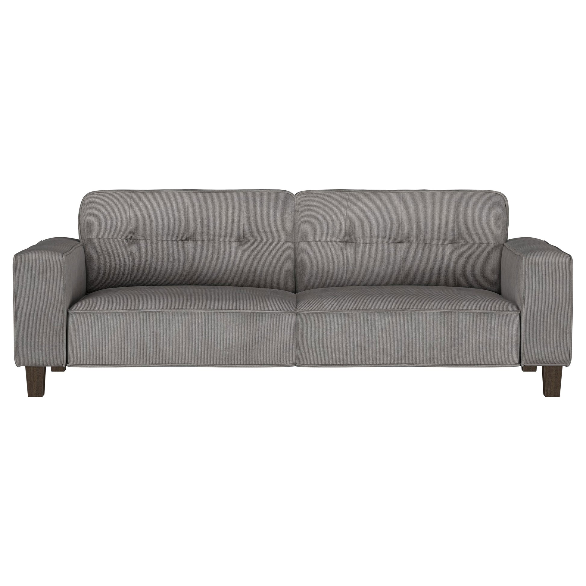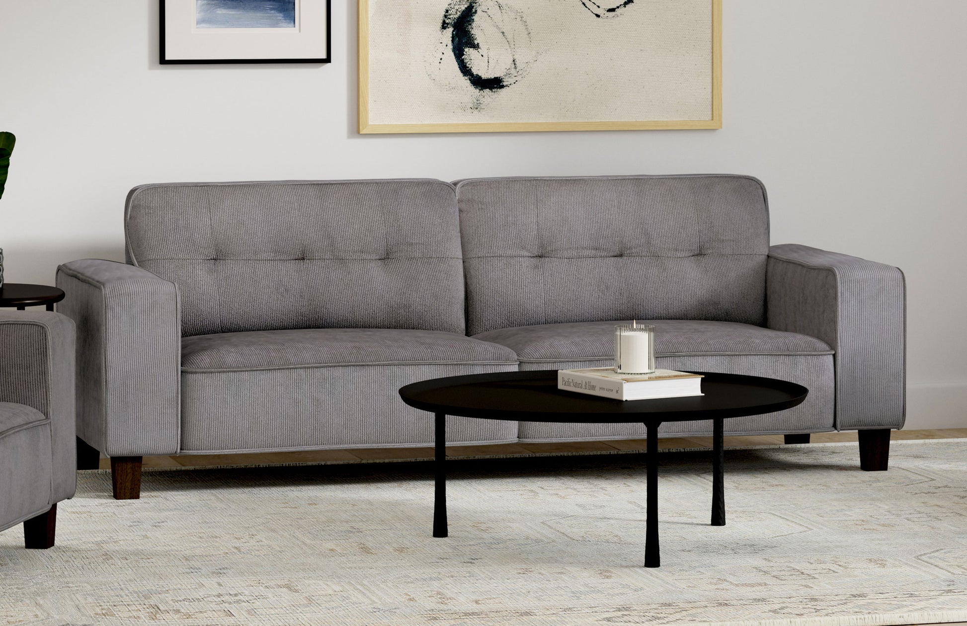 Create a stylish and infinitely comfortable and inviting living space with a modern sofa. Its timeless stance features wide track arms that pair perfectly with plush cushions for an indulgent seating experience. Great for game days, entertaining, or evenings at home, the sofa features plush upholstery with corduroy inspired texture that adds depth and dimension. Back cushions are plush and tufted, offering a grid pattern that's clean and refined. Tapering feet complete the look, offering height that creates an airy finishing touch perfect for modern living.