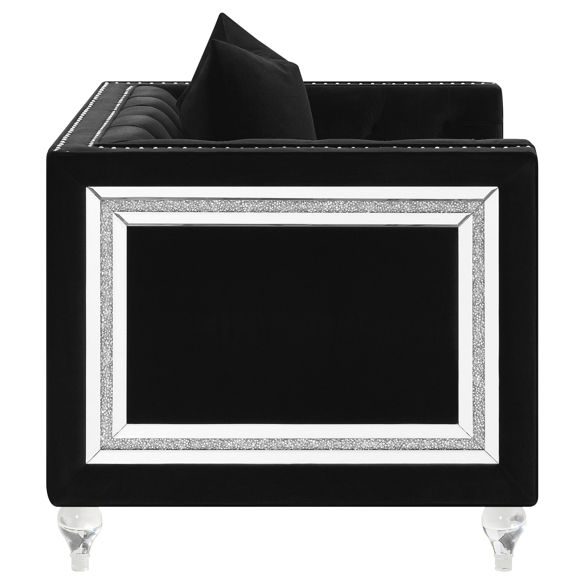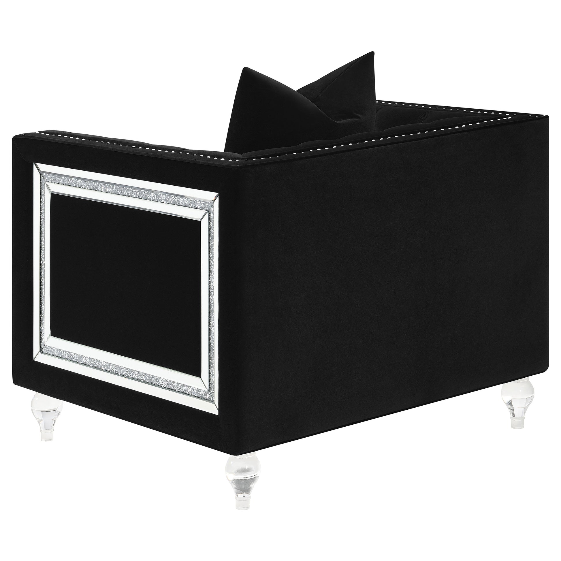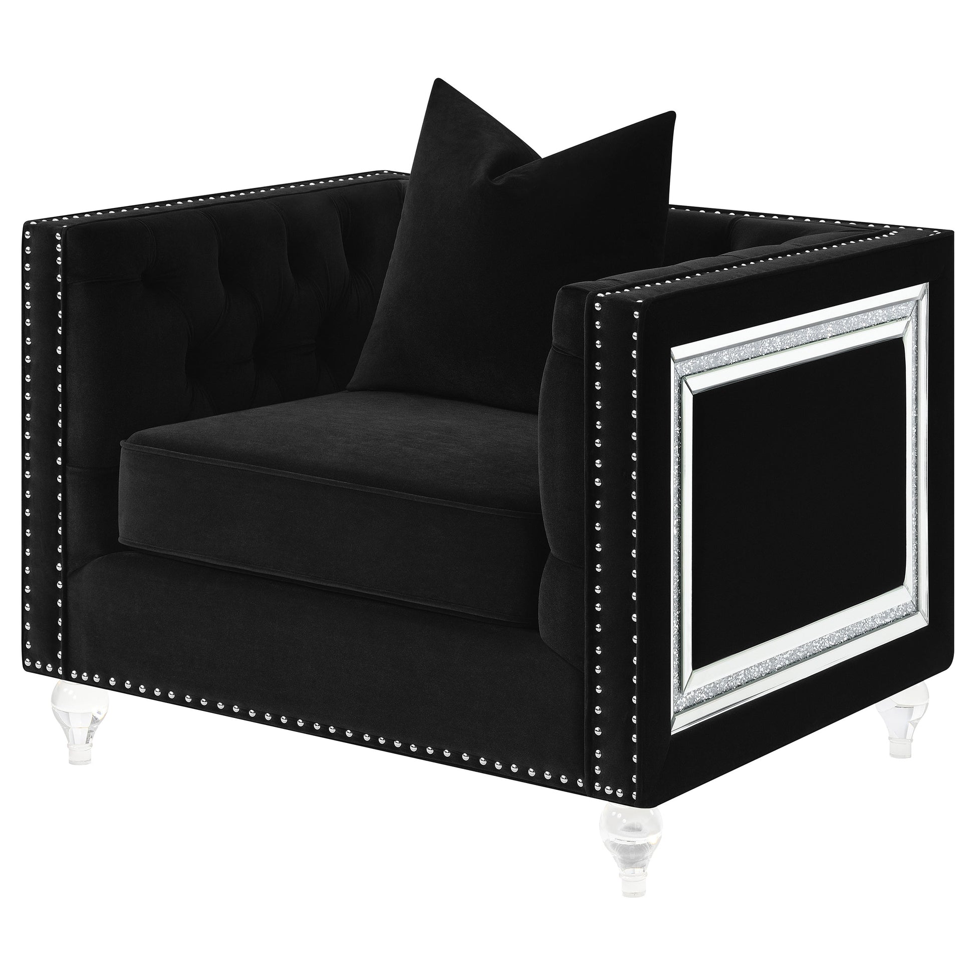 Elevate your living room's style with this tuxedos style club chair. Featuring a classic button tufted interior backrest and squared, straight arms, this chair offers a refine, timeless look that blends into a modern decor. Accented with sparkling individually hammered nailhead trim and turned acrylic legs, this chair lends an elegance like no other. Each arm also features window shape accent with lustrous mitered mirror and acrylic crystal frame inset, adding a Hollywood regency flair. Perfectly suited for contemporary living rooms and seating areas, this glamorous club chair is also wrapped in a deep black velvet upholstery, allowing it to complement color palettes and match existing decor tastes.