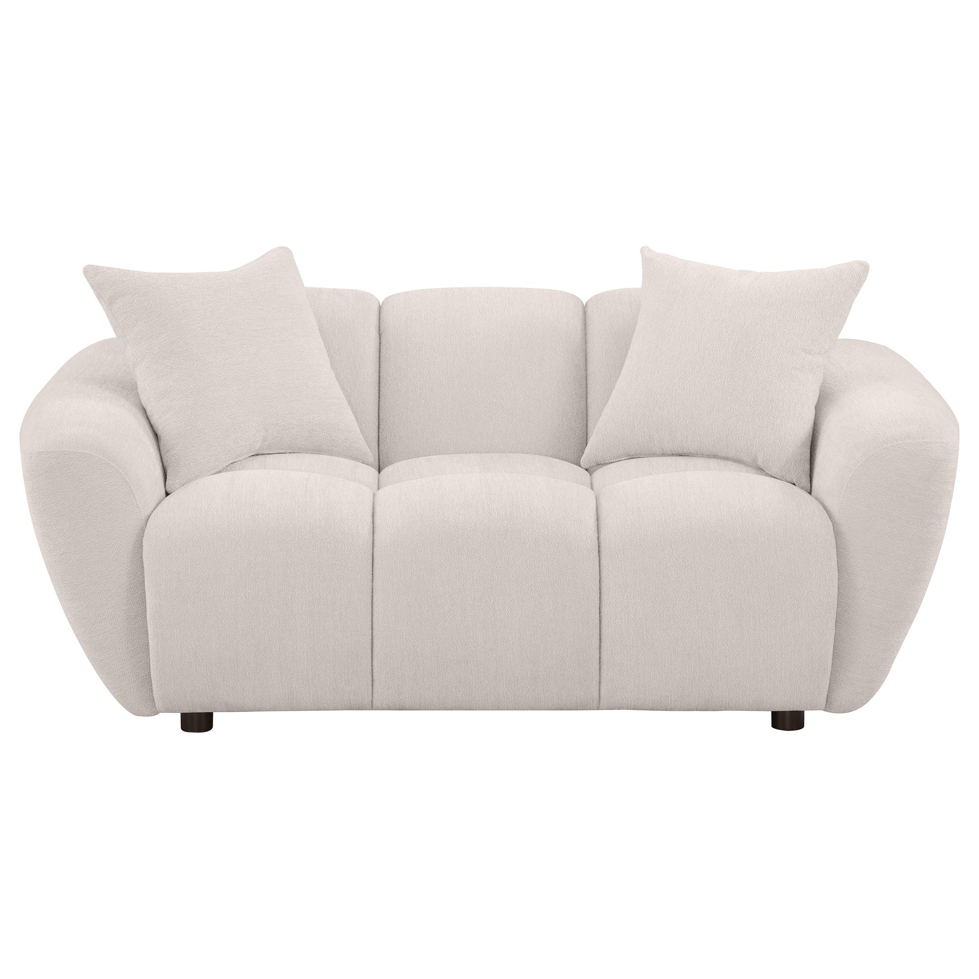 Contoured and contemporary, this greige chenille loveseat showcases sculptural volume and tailored construction. Splayed arms frame a wide, grid-tufted profile, while deep channeling emphasizes its bold silhouette. An attached waterfall seat features pocket coil support beneath plush foam, ensuring long-lasting comfort. Textured upholstery adds soft dimension, and two matching knife-edge pillows finish the look. A striking blend of form and function for modern lounging.