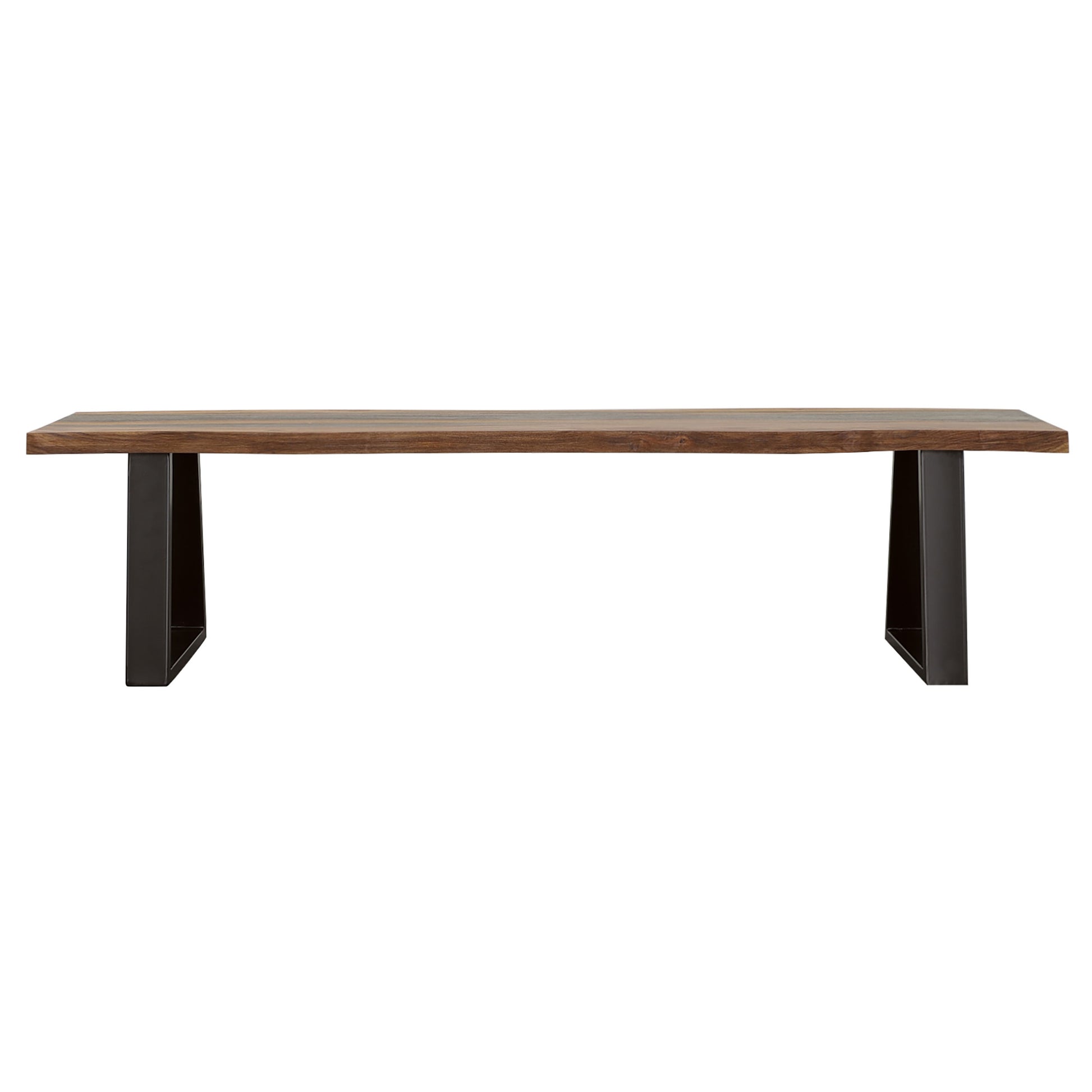 Bring a touch of organic beauty and modern edge to your dining space with this solid sheesham wood dining bench. Featuring a live edge seat, each piece showcases unique natural grain variations for a one-of-a-kind look. The black powder-coated metal base provides sturdy support with a sleek, angular design that enhances its contemporary appeal. Perfect for seating two to three guests, this bench is a versatile addition to rustic, industrial, or modern dining settings.