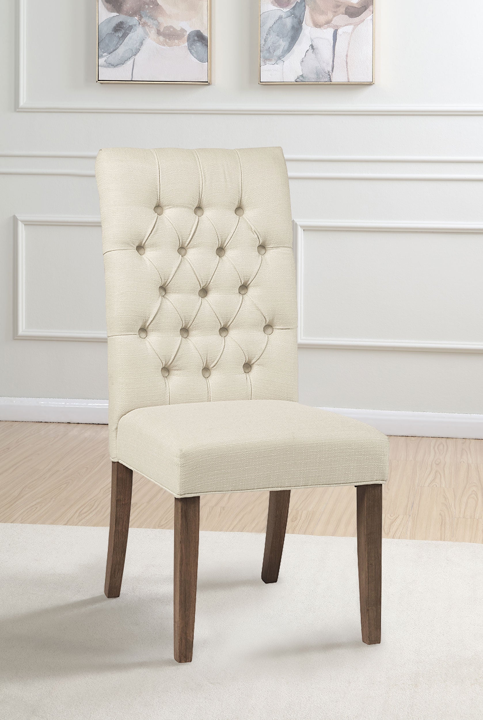 This set of two wood and fabric tufted parson chairs has a handsome rustic design. Each chair is crafted with durable rubberwood and plywood. Stylish elements shine through in the sand-colored linen-like fabric upholstery and tufted seat back. A warm vineyard oak finish completes the look of this charming set. You'll love the versatility that makes these chairs well suited for both everyday or formal dining.