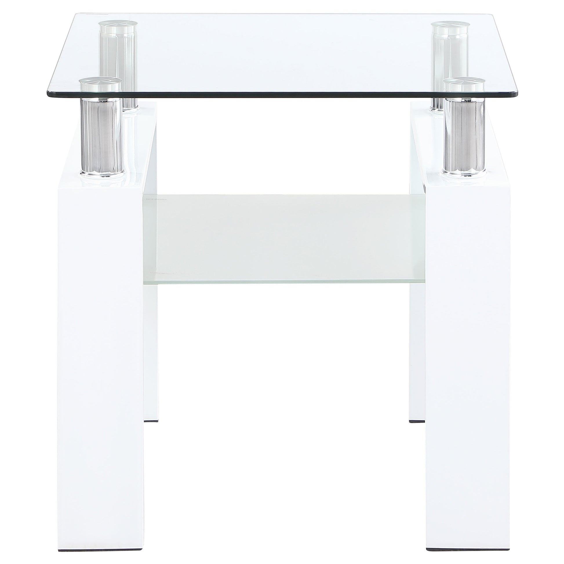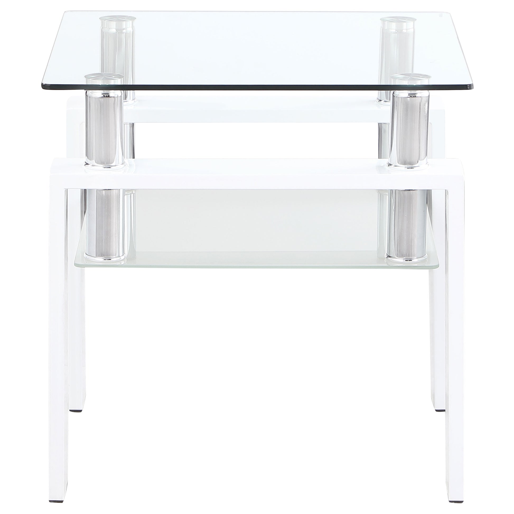 This square end table features a clear tempered glass top, complemented by a frosted tempered glass shelf for added storage or display. Supported by a sturdy metal frame, this piece combines both form and function. Its sleek design offers a modern look that suits a variety of contemporary living spaces. Whether used for storage or as an accent, this end table seamlessly blends with your home decor while providing a clean, open aesthetic.