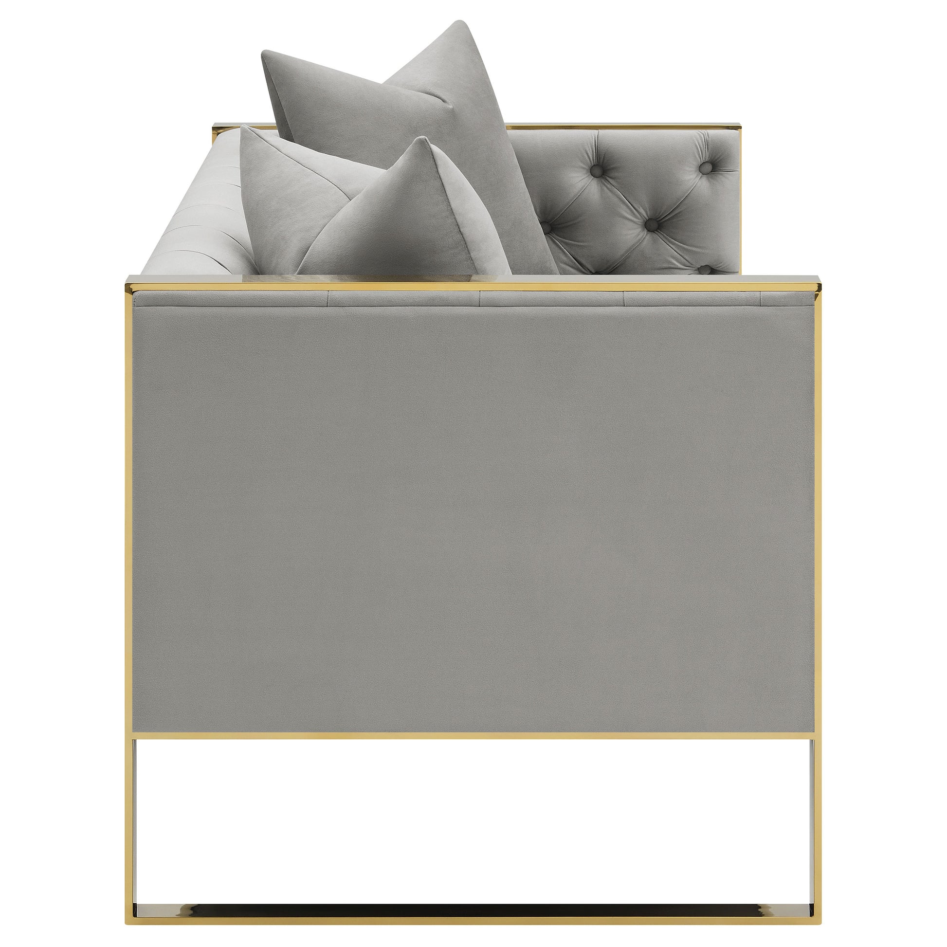 Glamorous and stylish, this sofa and loveseat offers a formal touch of Hollywood Regency to a home. Both seats and wrapped in a light grey velvet upholstery, nestled by a sleek stainless steel arm and base in a lustrous gold finish. Each piece also offers a shelter style backrest and arms, with a button tufted interior. Each bottom cushion offers a smooth, yet tight waterfall style bench. Included in this set are four matching accent pillows.