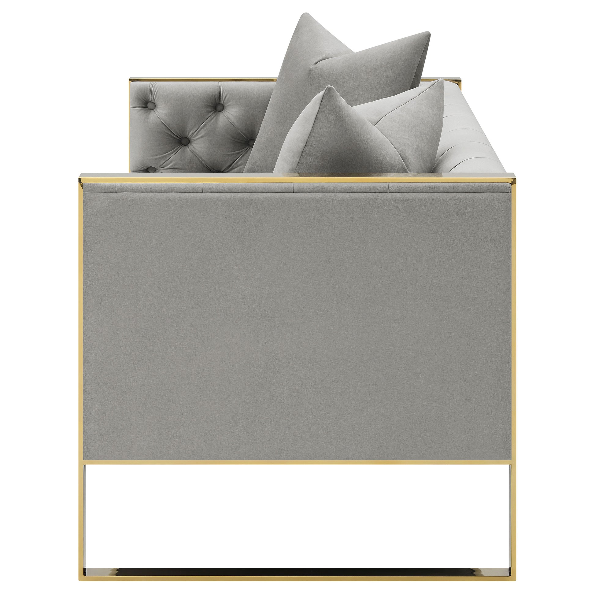 You'll love the contrast of tones and materials in this modern two-tone loveseat, but it's the cozy comfort that will leave you hooked. The button tufted velvet upholstery comes in an elegant light grey finish that's soft to the touch. Two throw pillows are included for your next restful lull. Then there's the gold stainless steel base that wraps around the arms and forms U-shaped legs. The mix of gold and grey with the blend of metal and soft fabric makes this loveseat a feast for the senses.