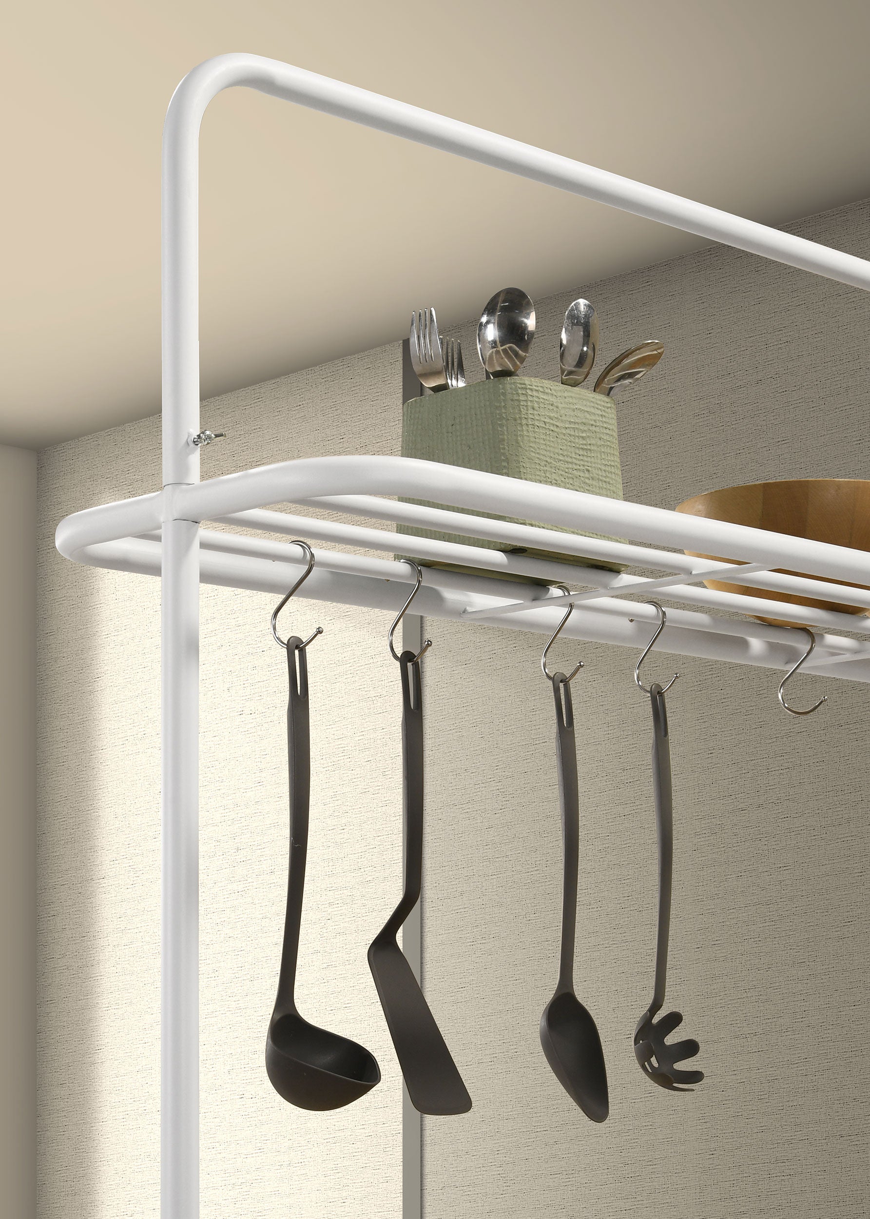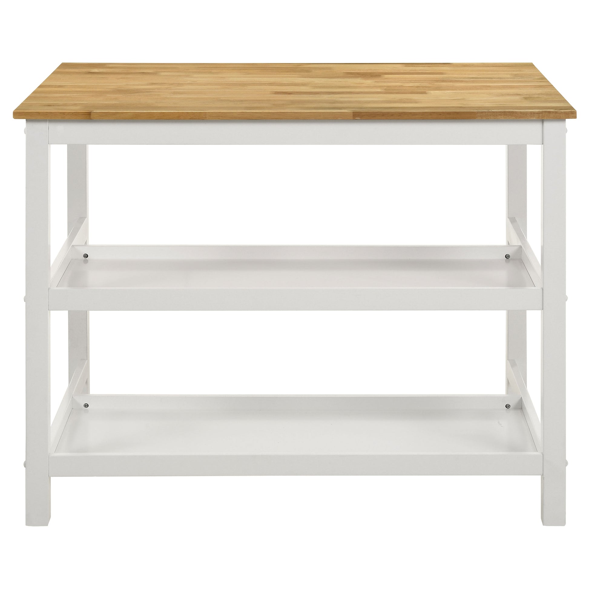 Expand the workspace and storage potential of your kitchen with a charming modern farmhouse kitchen island. Perfect for prep, it boasts a natural brown wood finish top with a butcher block-inspired look. Its white base is a crisp choice, lightening the overall look to keep your kitchen looking spacious and inviting while adding two shelves for easy storage of essentials. On top, a pot rack adds seven hooks that free up cabinet space elsewhere in your kitchen. Embrace casual cottage or coastal vibes in your welcoming family kitchen.