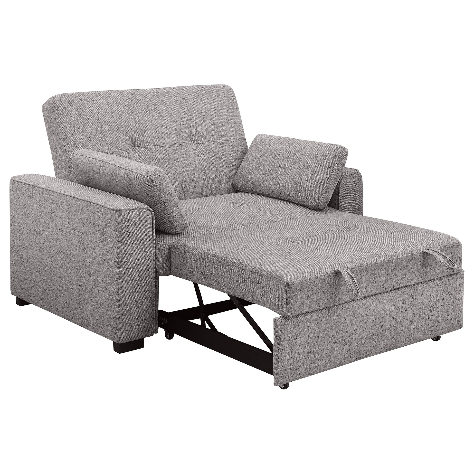 Add flexibility to your home office or living room with a modern sofa bed that doubles as a comfortable armchair. Perfect for guests or lounging, the armchair converts to a single bed, for a comfortable night's sleep. It's neutral upholstery suits in a variety of spaces, while biscuit tufting and piped trim creates a tailored look and feel. The sleeper includes two accent pillows that are ideal for relaxation no matter its configuration. Track arms adds structure and definition to clean-lined design that blends anywhere.