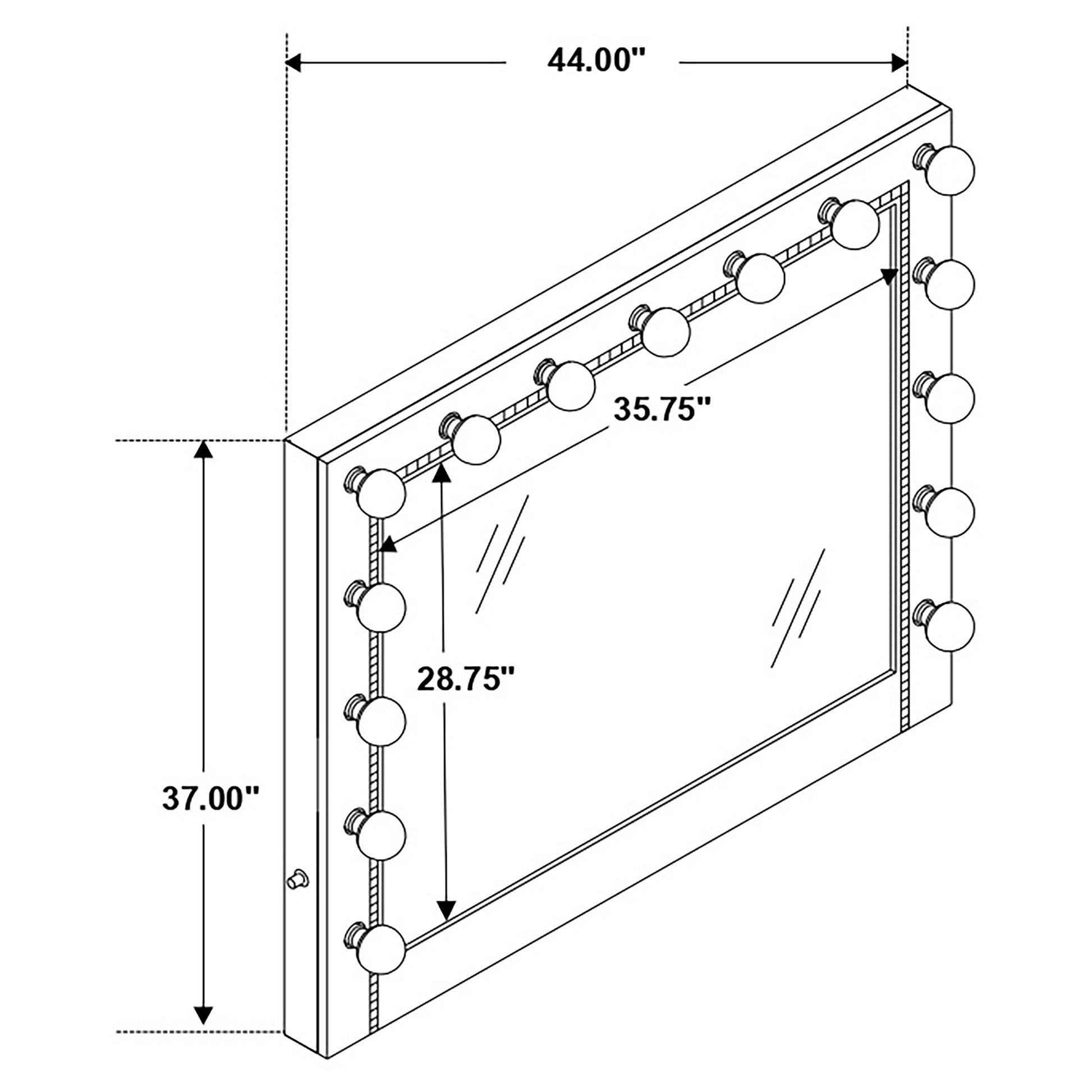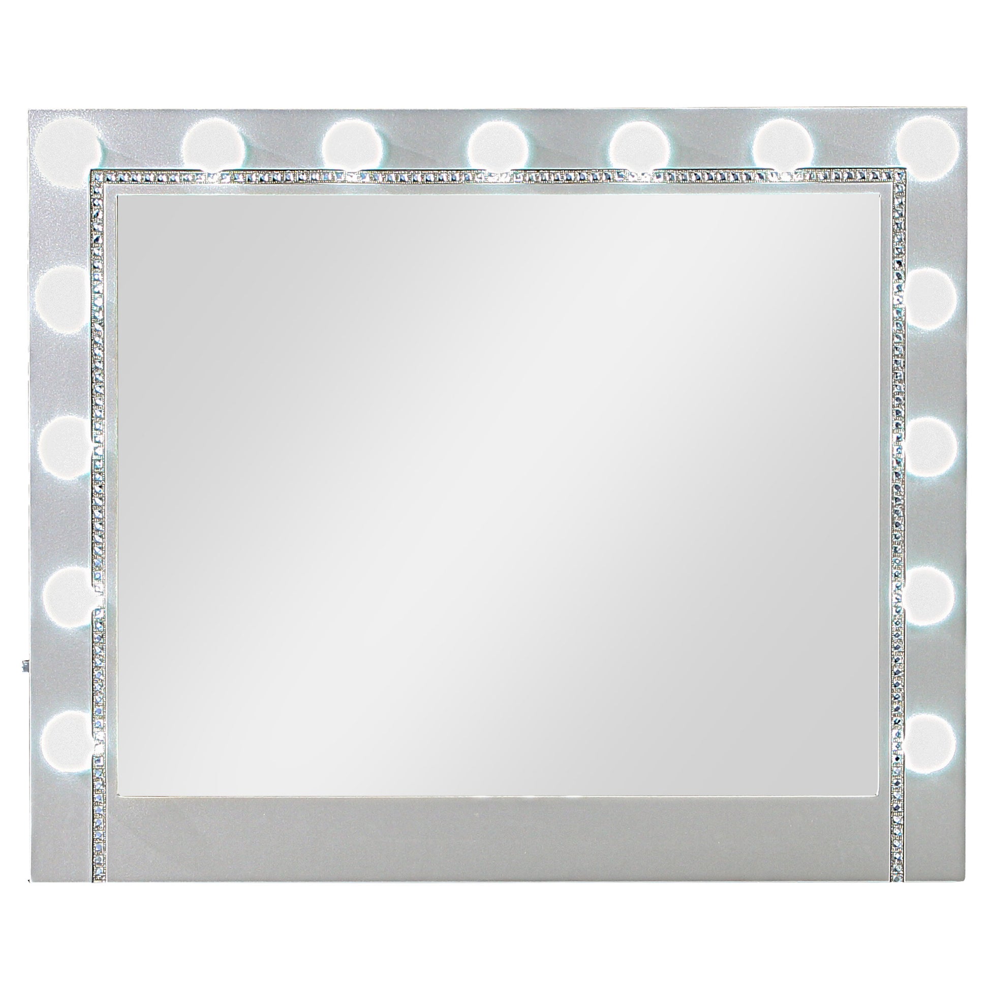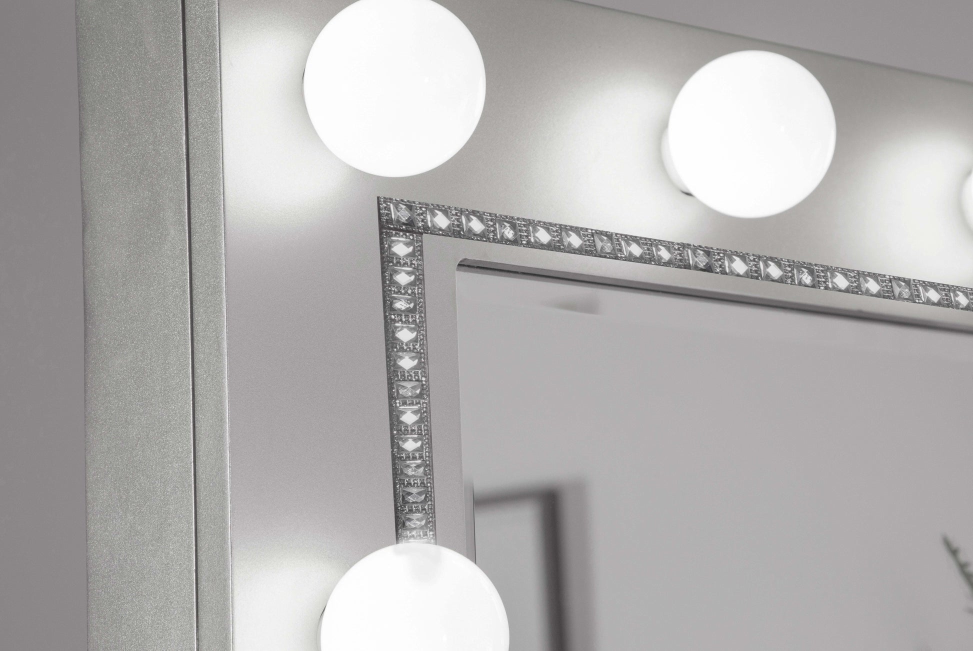 Beautiful and functional, this glamorous vanity mirror invites you to apply cosmetics, style your hair and more. Featuring a wide frame, this mirror lends itself to a variety of color palettes. Prepare for your day or evening with the even glow, surrounded by a generous 15 bulbs to create an even glow. Coordinating with the rest of the Eleanor bedroom collection, this Hollywood mirror can be situated upon a matching dresser that reflects the same crystal-like mirror tile insert that this stunning framed mirror provides. Completing the timeless glam style of this essential bedroom furniture piece is a beveled mirror that lends a classic touch.