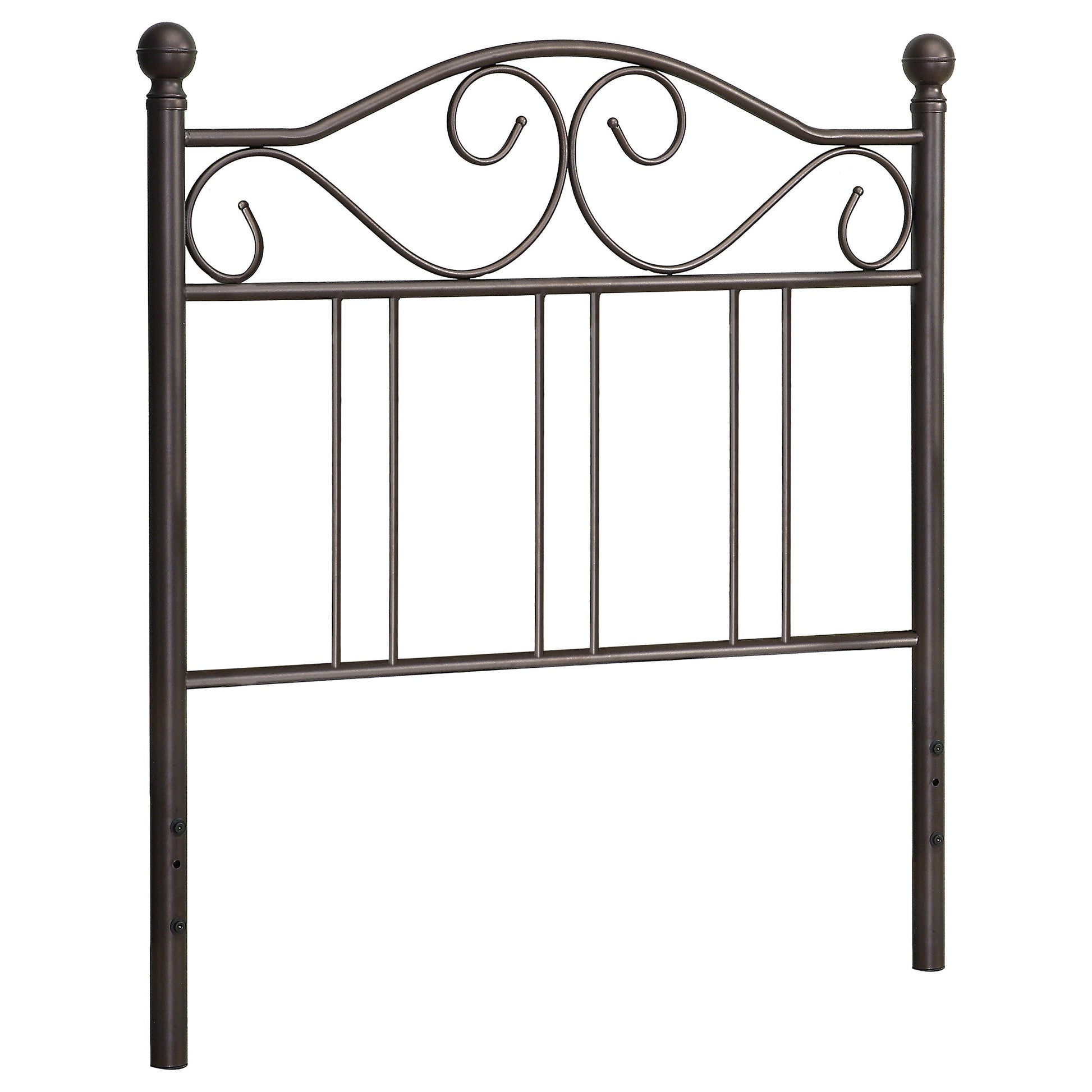 Alluring, romantic scrolls form the artistic personality of a classic. This twin headboard delights in a child's room or guest room. Fashioned from metal, its ornate design features vertical rods and ball-topped frame supports that contrast with fluid curves. Brown finish metal is both inviting and neutral. This headboard creates a tall, impressive embellishment to a twin bed and a focal point in a child's room.