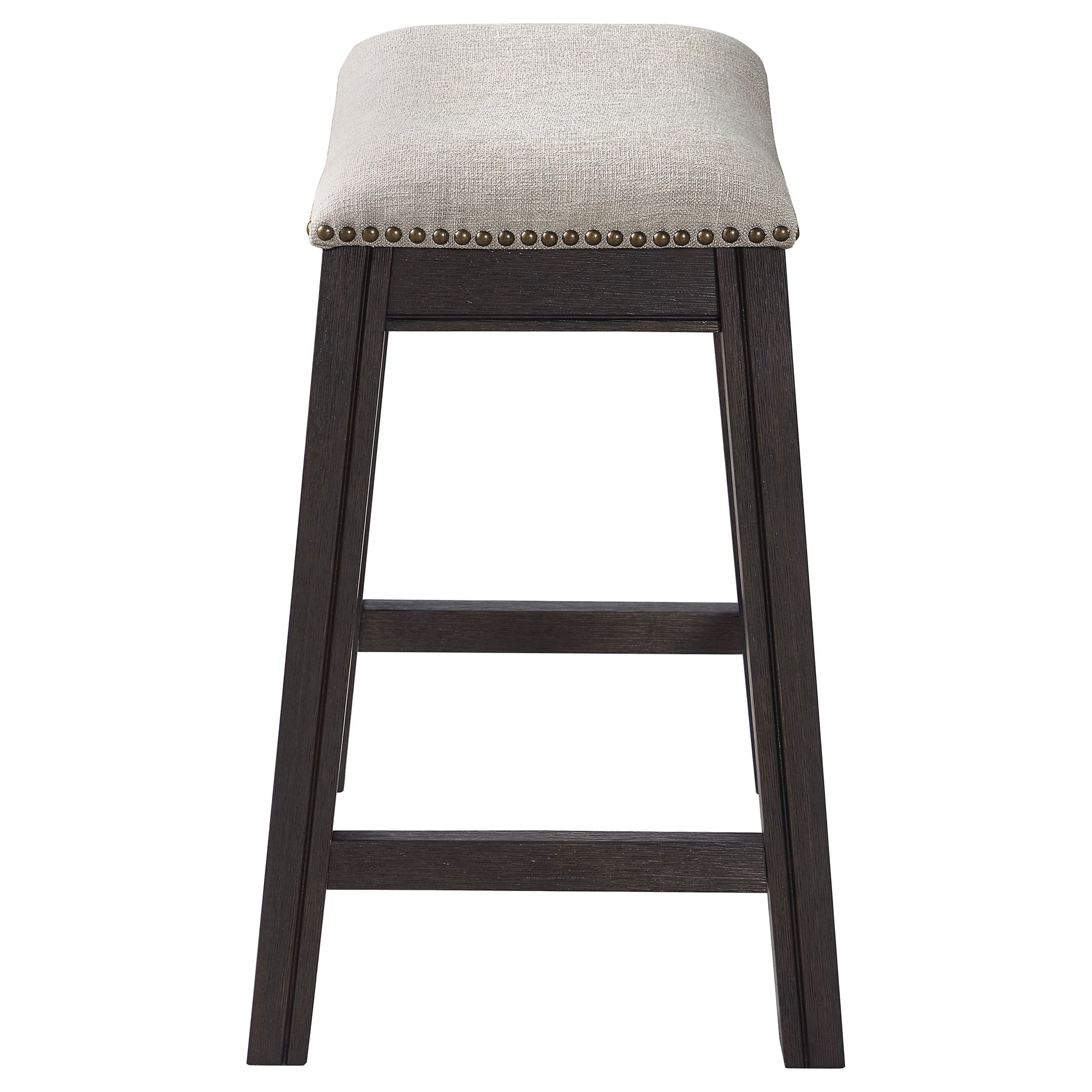 Put final touches on an inviting kitchen island or dining table with a modern counter height stool. It features a backless saddle seat complete with light beige upholstery and foam padding for superior comfort. A dark gray finish is crisp and versatile, complementing in a variety of spaces and offering neutral appeal. Upholstery is trimmed in nail heads that add of ideal dose of tailored texture and dimensionality. The counter stool is complete with a built-in footrest that adds support for everything from a quick cup of coffee to a leisurely meal.