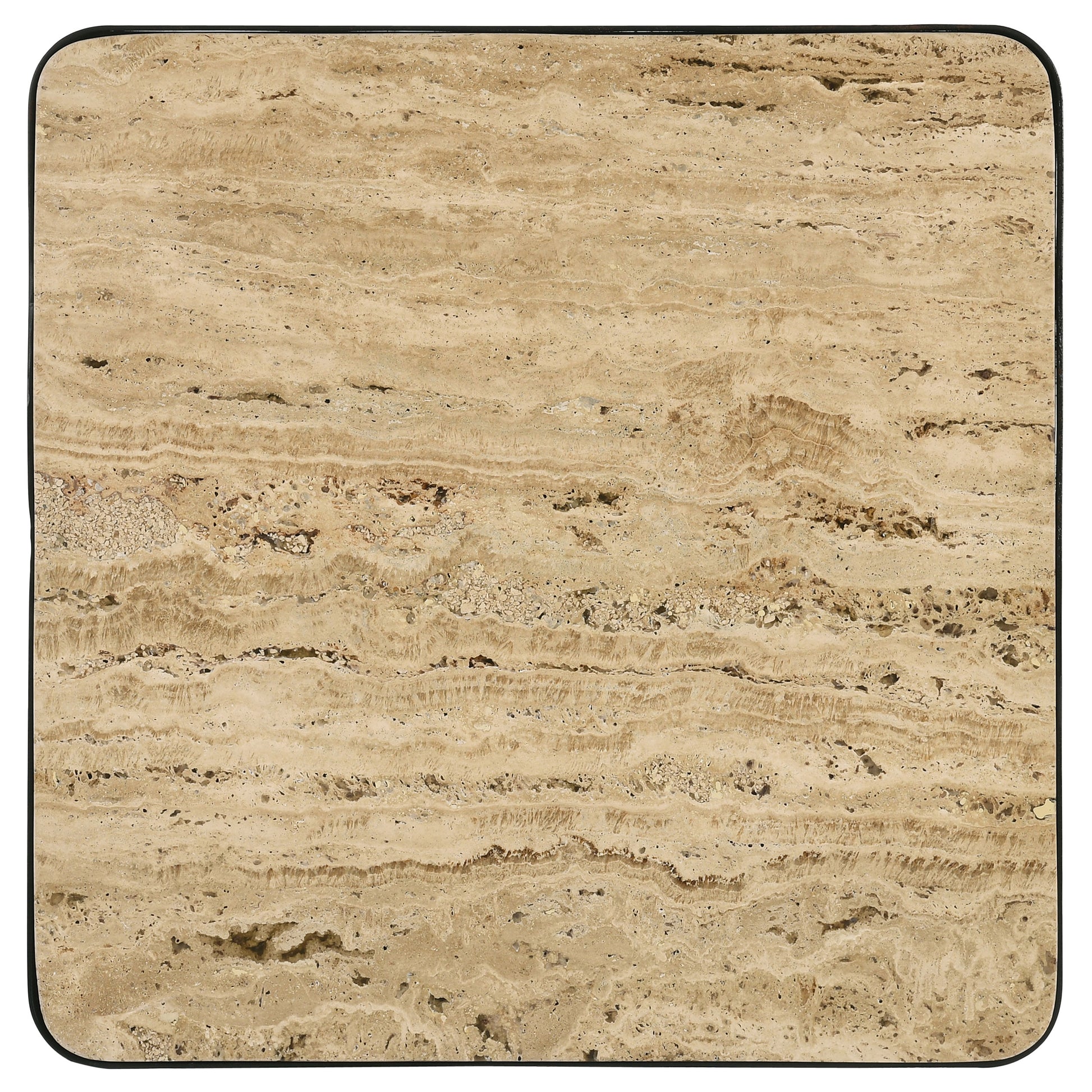 A blend of modern geometry and classic elegance, this square accent table makes a sophisticated statement in any space. The travertine stone tabletop adds a touch of natural beauty, featuring unique textures and organic variations that enhance its charm. The iron base with a matte black finish boasts a skewed, asymmetrical design, offering a striking visual contrast while ensuring stability. Perfect as a side table, nightstand, or display stand, this versatile piece brings a refined yet contemporary appeal to living rooms, bedrooms, or stylish lounge areas.