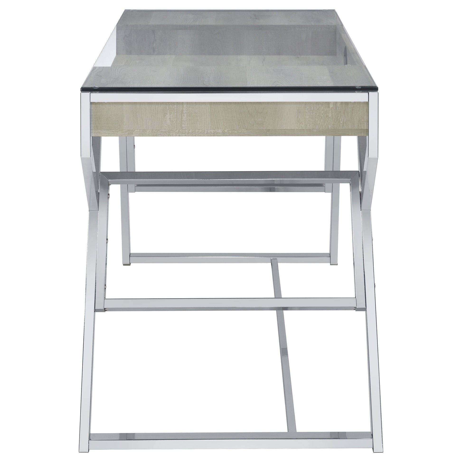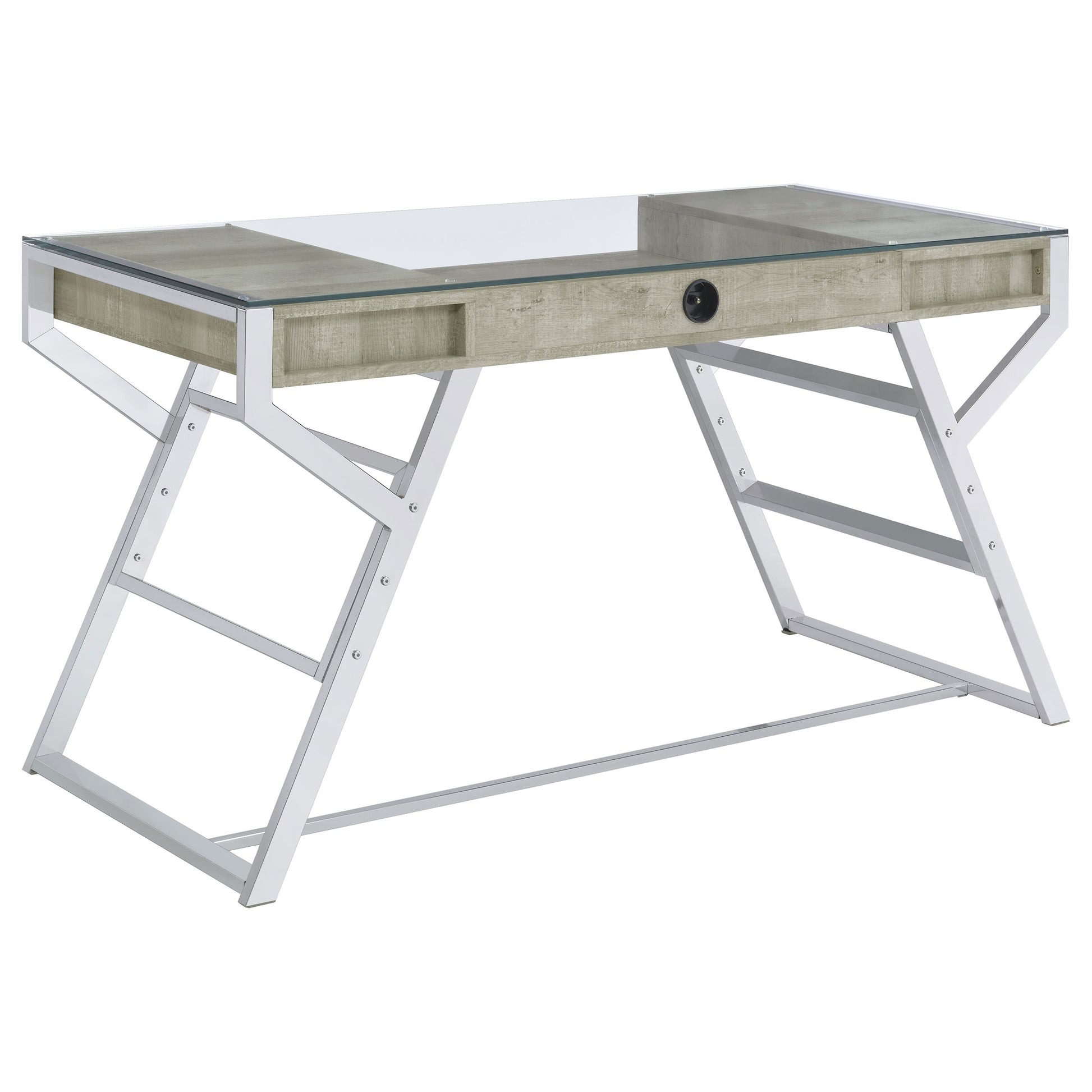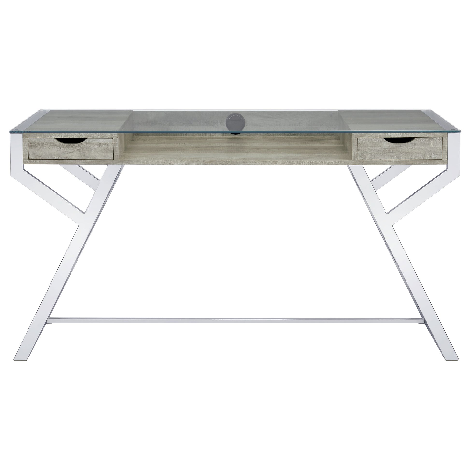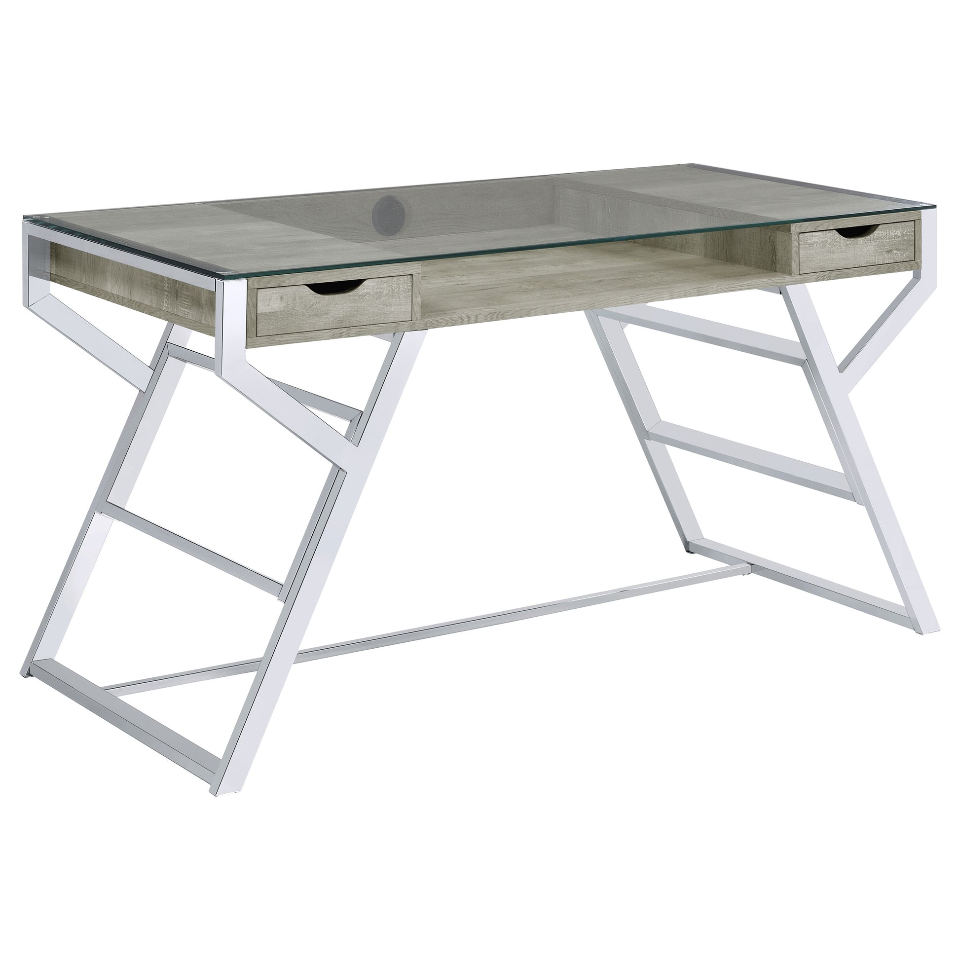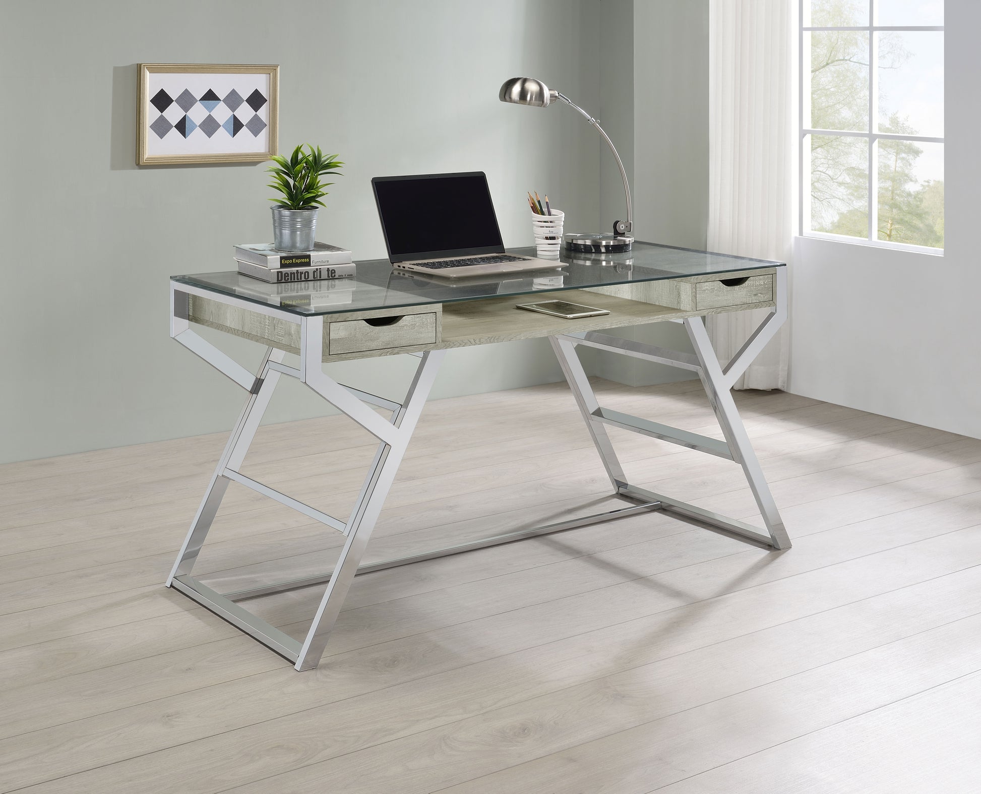 Perfect for a contemporary home office with this striking, sharp silhouette, this writing desk offers a convenient space to get work done. Designed with a lovely rustic grey driftwood finish, the desk tabletop features an open center space for sliding keyboards and paperwork, flanked by two drawers for hiding and organizing accessories. The tabletop itself rests on a supportive heavy gauge steel frame that flares outward in a ladder-like design. With lustrous, electroplated polished chrome finish, the legs offer a hint of glamour. Across the table is a smooth clear tempered glass top that lends one final chic touch.