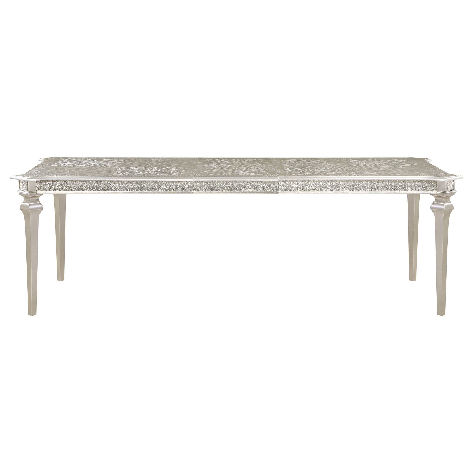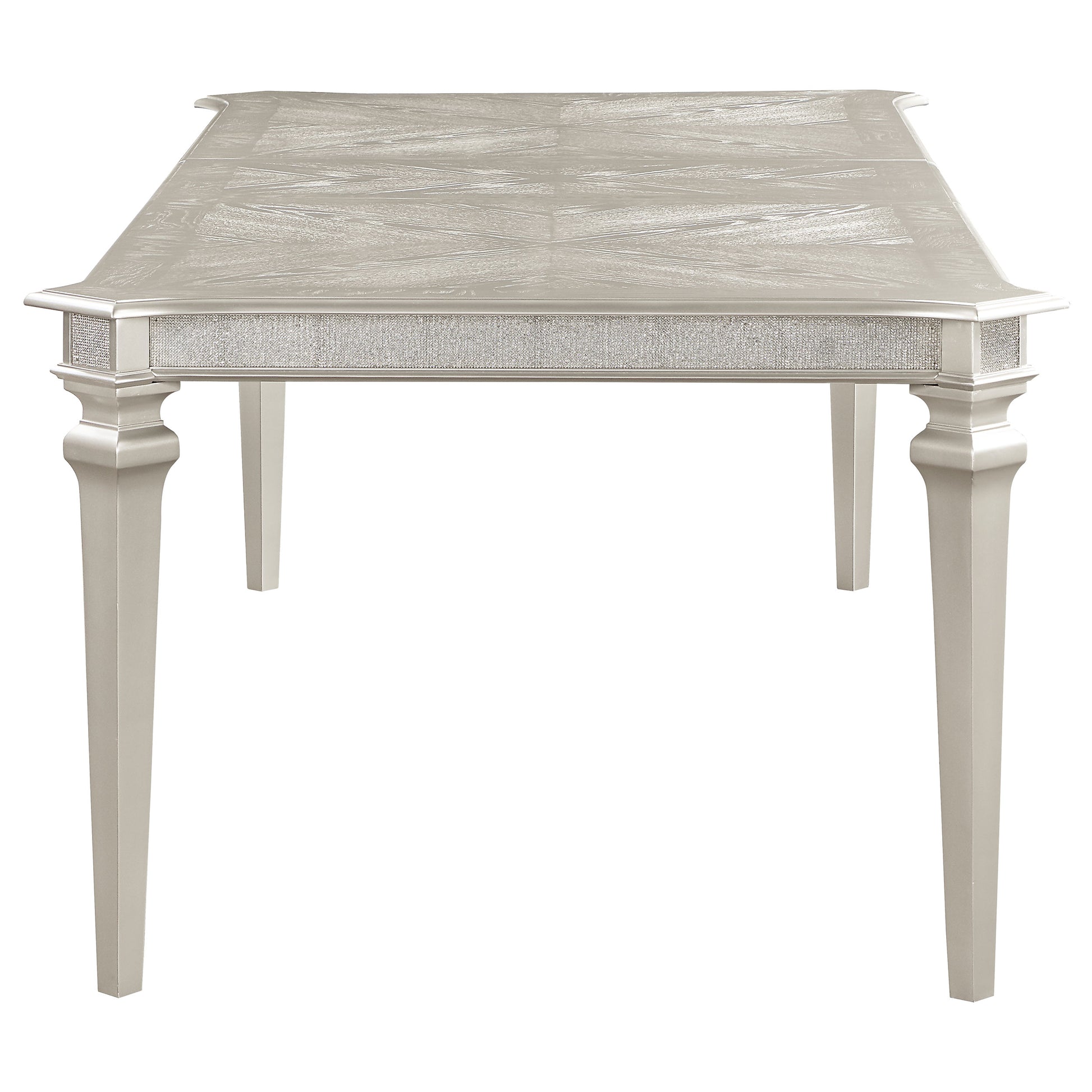 Elevate your dining area with our luxurious Evangeline dining table. Boasting attention to detail with faux diamond-trim around the table, this collection includes an 18" removable leaf to comfortably seat up to eight guests, and grey felt-lined top drawers with tinted drawer boxes in the server for added luxury.