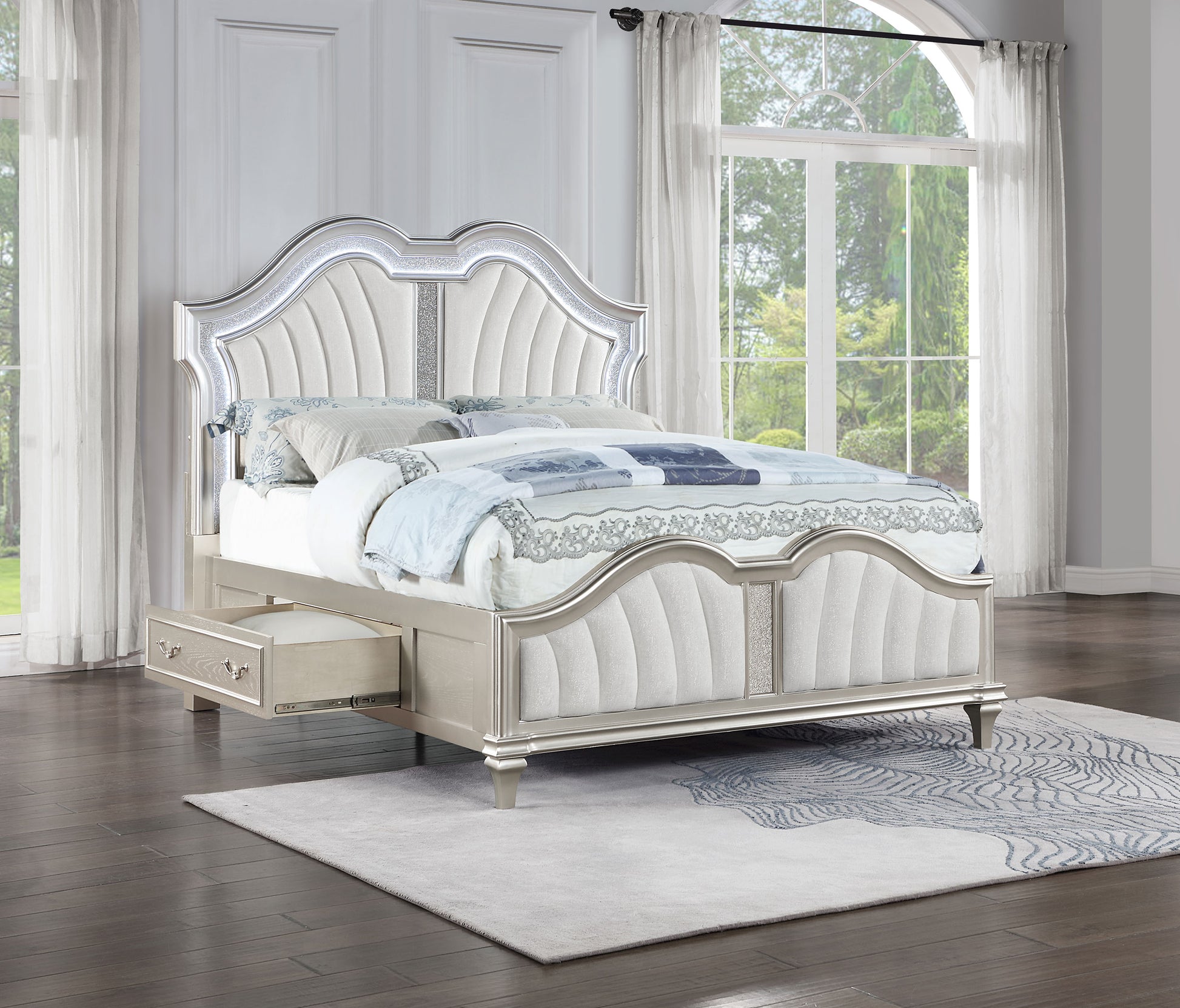Anchor a glam bedroom design scheme with a chic silver oak finish modern storage bed with LED lighting built into the headboard. Its metallic look adds elegance, while glittering panels and molded trim pair with a double arch silhouette to bring sophisticated flair to the head and footboards. Ivory upholstery softens the head and footboards, and is soft and light to enhance a stylish bedroom. The bed offers easy storage with one drawer built into the rail on each side, perfect for everything from personal items to linens and beyond. Hanging drawer pulls add a traditional touch to each drawer.