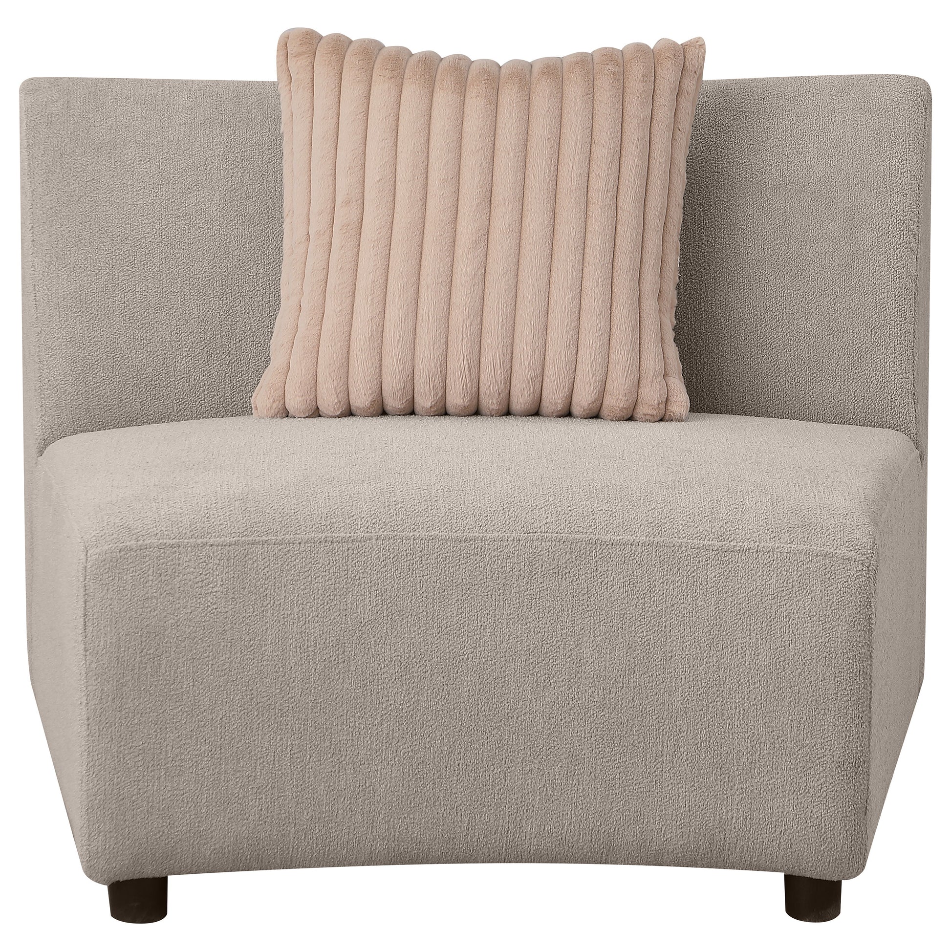 Add length to your sectional or offer a standalone seat with a modern armless chair. Its gently curved silhouette stands out in a sophisticated space, with graceful presence no matter its utilization. The armless chair boasts a wide stance, complete with sinuous springs and pocket coils for excellent support and comfort. Greige upholstery is fresh and light, offering a stylish complement to surrounding decor. A single accent pillow adds texture while delivering wonderful comfort in your living room.