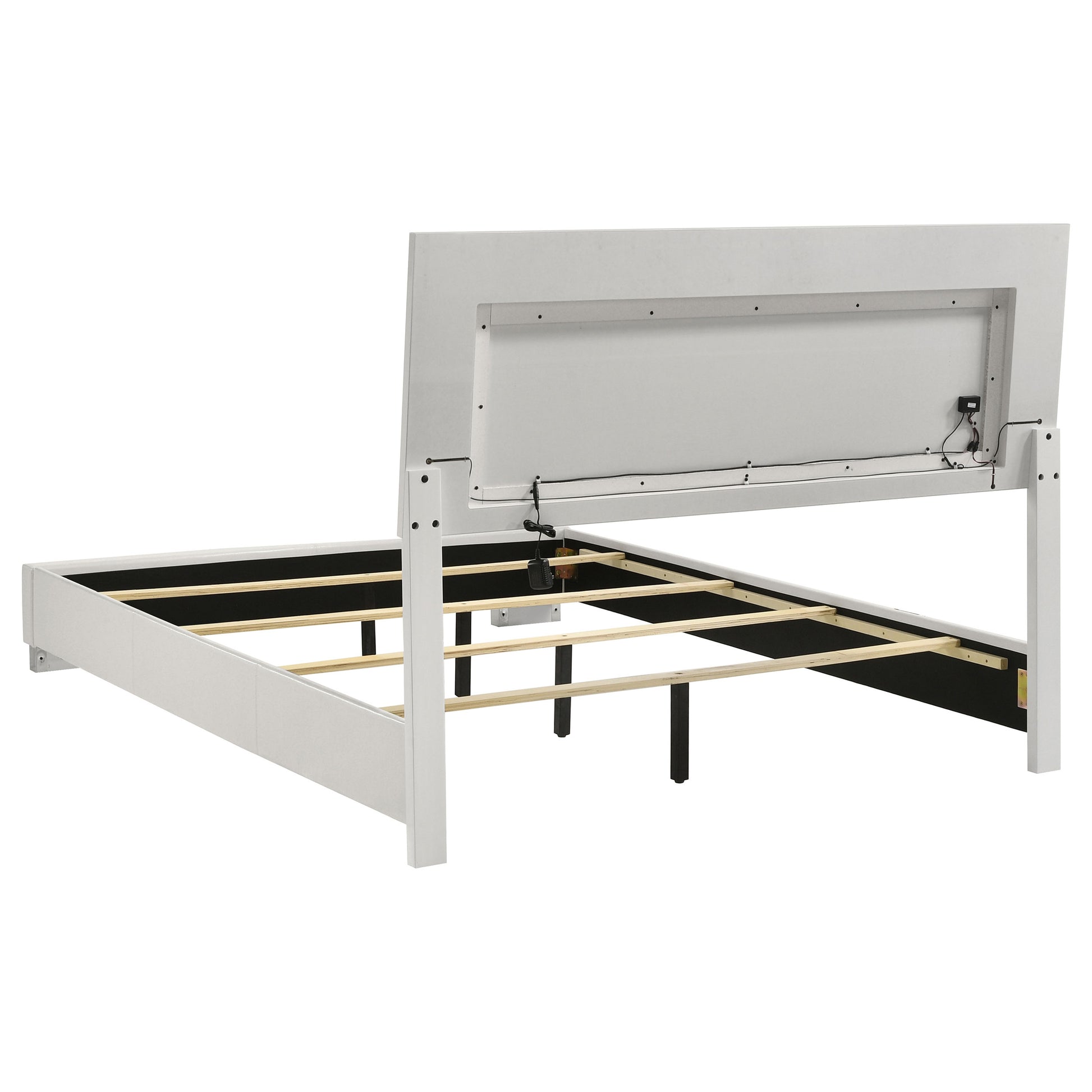 Modern design meets ambient lighting in this contemporary bedroom set. The bed features a white high gloss headboard with built-in blue LED lighting, activated by a convenient touch switch. A faux leather upholstered bed frame adds a refined touch, while matching storage elements offer smooth metal glides and chrome-finished details. With clean lines and integrated lighting, this set adds both functionality and visual impact to any modern bedroom.