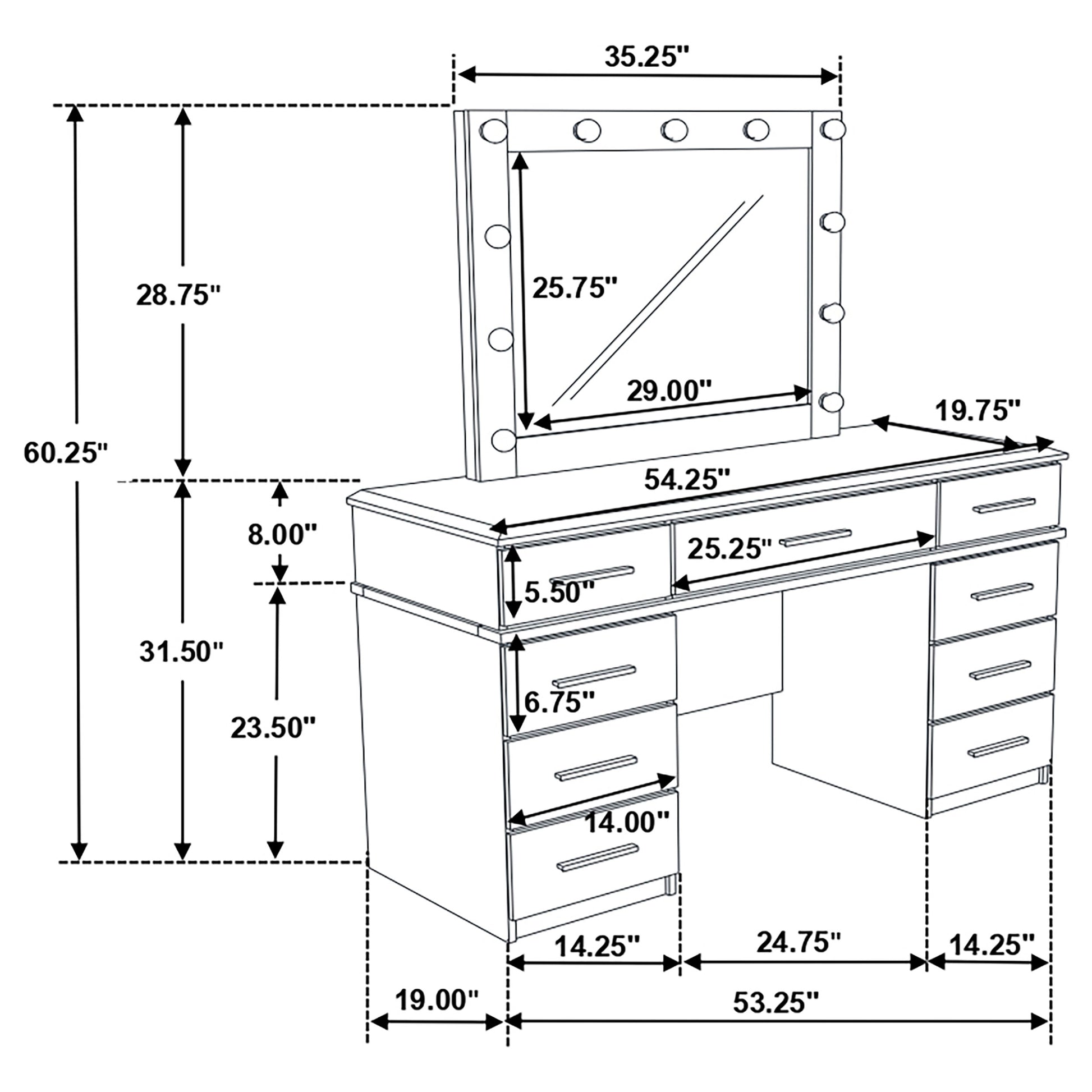 Covered in a high gloss white finish for an all-around sleek look, this contemporary vanity desk and matching mirror are perfect for dressing areas and bedrooms. Store cosmetics, perfume bottles and more within the multiple drawers to keep your vanity neat and tidy. Felt-lined top drawers invite you to also keep delicate items like jewelry, silk scarves and accessories. Situated on the top of the vanity dresser is a Hollywood style mirror, surrounded by 11 bright white LED lights that offer an even glow. Sleek chrome metal pulls adorn each of the drawer fronts, lending a modern flair.