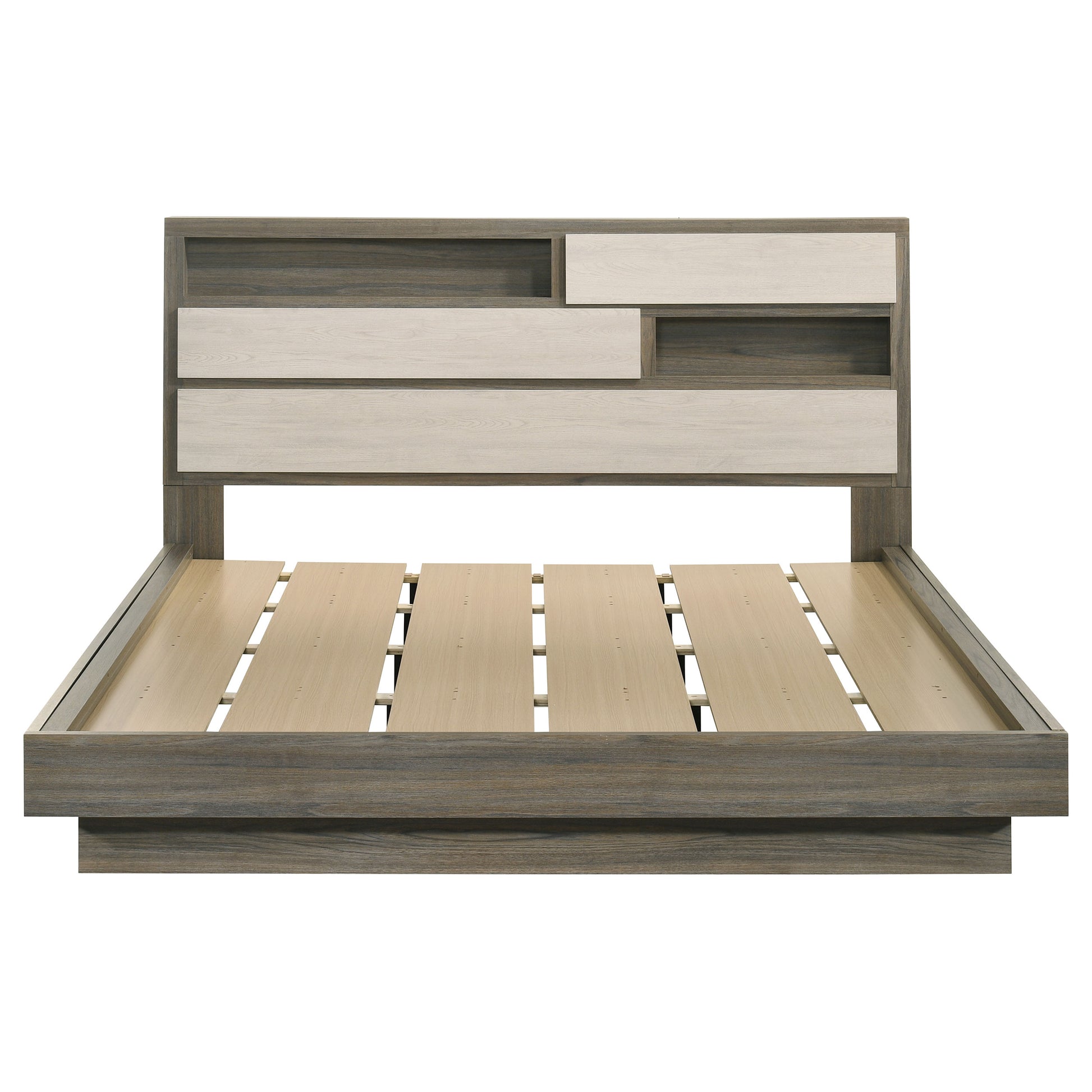 Discover contemporary elegance and smart design with this queen bed, part of a sophisticated bedroom collection. The bed features a stylish bookcase headboard with a hidden compartment, perfect for storing valuables or keeping bedtime essentials within reach. Crafted from durable melamine with a modern two-tone finish, this bed exudes both charm and practicality. Designed for lasting support, it offers a sturdy foundation for your mattress. Transform your bedroom into a haven of style and functionality with this innovative and elegant bed.