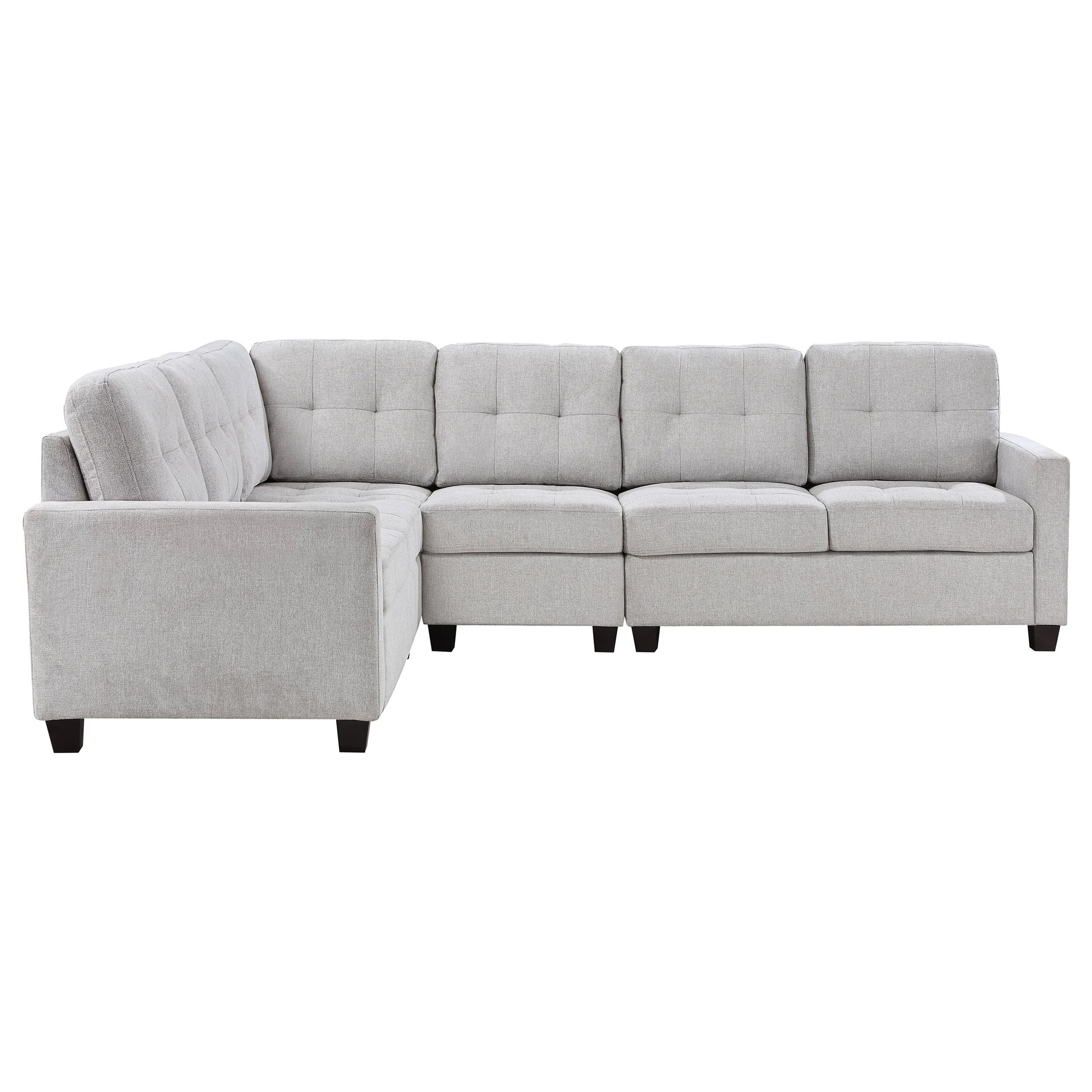 Ensure stylish seating for the whole family with a modern L-shaped sectional sofa. In beige for a warm, neutral presence, the sofa boasts tufted cushions and accent pillows that crate depth and dimension in an inviting living room. Back cushions are reversible for added versatility, while seat cushions are attached to ensure they stay in place when lounging or entertaining. Track arms establish a structured, simple silhouette, perfect for a wide variety of spaces and surrounding decor. Block feet taper to add the perfect finishing touch.