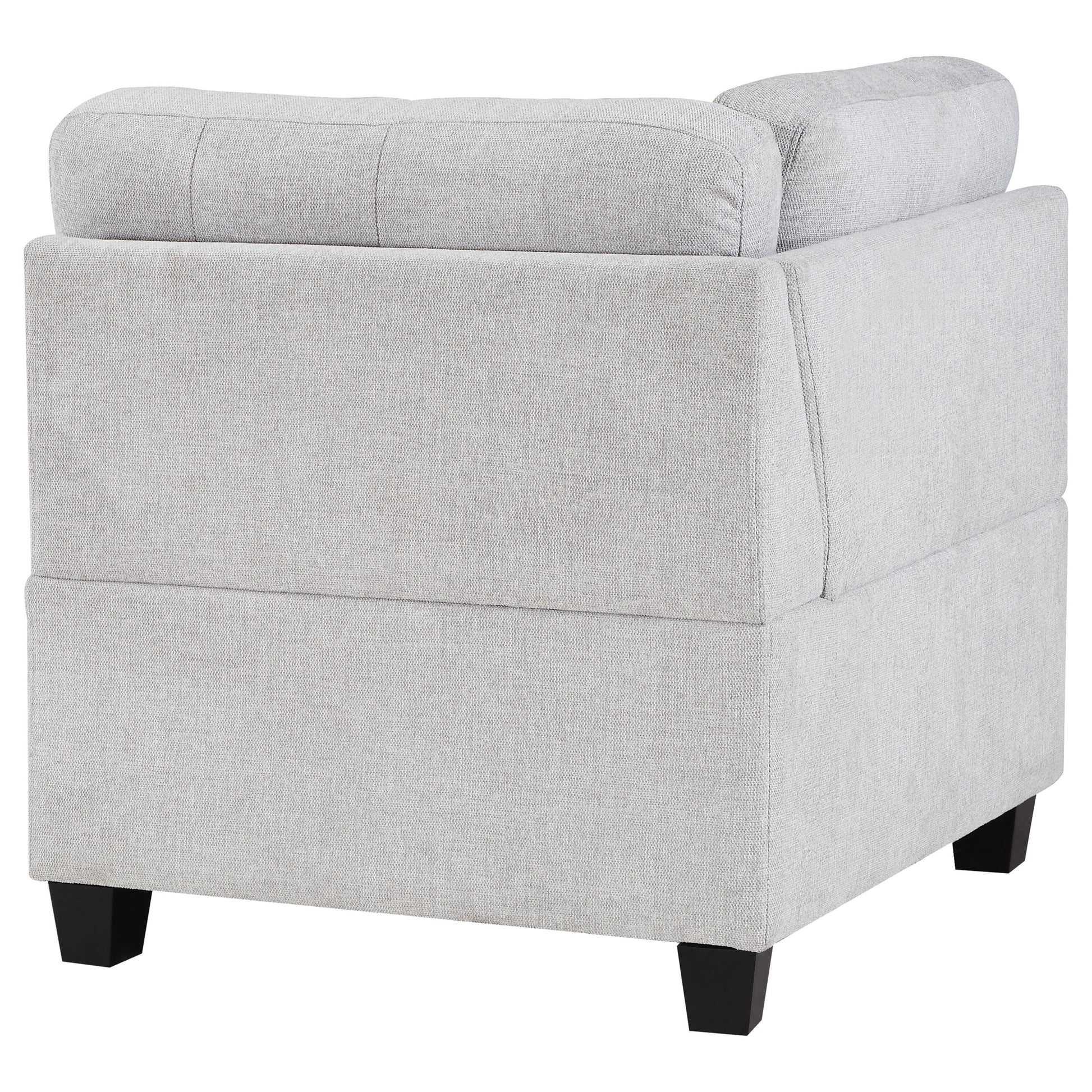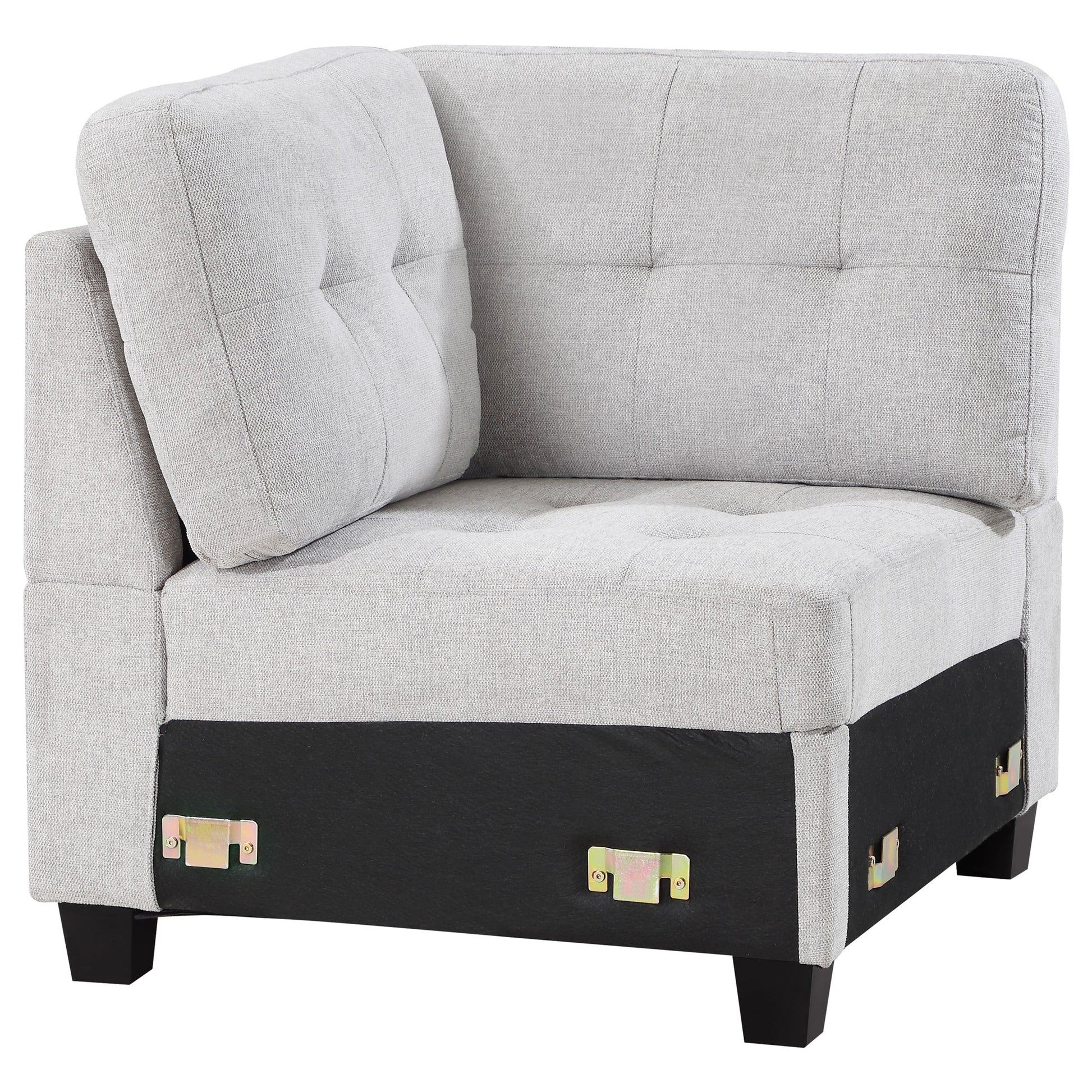 Customize a sectional that suits your space with a modern armless corner chair. In soft beige upholstery, it's the perfect centerpiece for your Georgina collection sectional sofa, creating a turn just where you need it to suit your living room. The corner features tufted cushions, one seat and two back, and sinuous spring decking under the seat, offering impressive comfort and support. Legs are a black finish tapered block style, complementing surrounding decor while offering stability and support. This sectional piece is constructed with rubberwoods and plywood for optimal strength and durability.