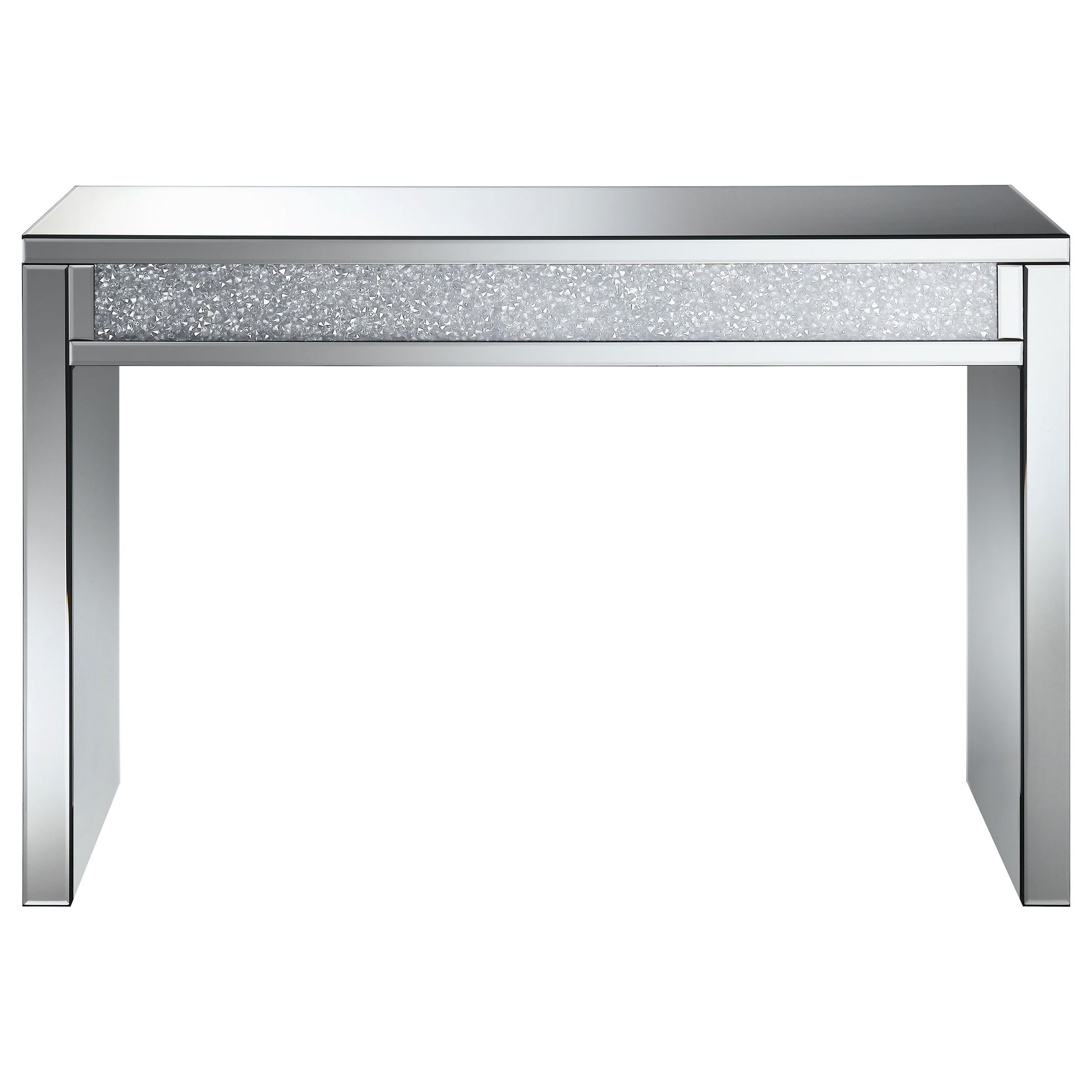 This mirrored console table features clean lines and a contemporary design, highlighted by a central inlay of sparkling acrylic crystals. The sturdy frame and smooth mirrored surfaces create a striking, modern aesthetic that elevates any room. The acrylic crystal accent is placed seamlessly within the design, adding a touch of glamour. With its sleek and minimalist structure, this console is perfect for entryways, living rooms, or hallways, offering both beauty and functionality.