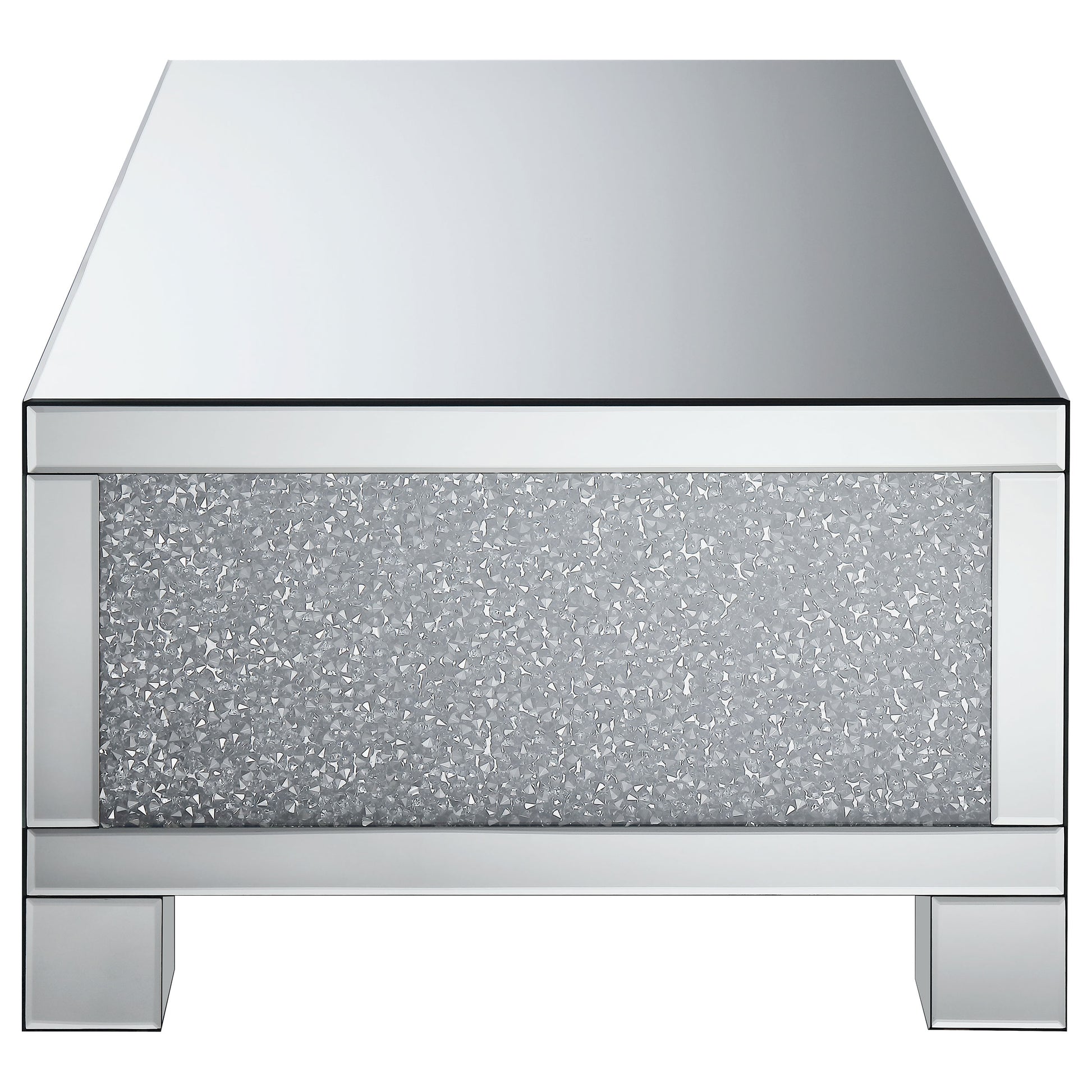 This 48-inch rectangular mirrored coffee table is the perfect centerpiece for a glam living room. Designed with an engineered wood frame, it features fully mirrored surfaces that reflect light beautifully, while acrylic crystal accents provide dazzling sparkle. Its clean-lined, modern silhouette blends function with glamorous sophistication, ideal for hosting or showcasing decor.