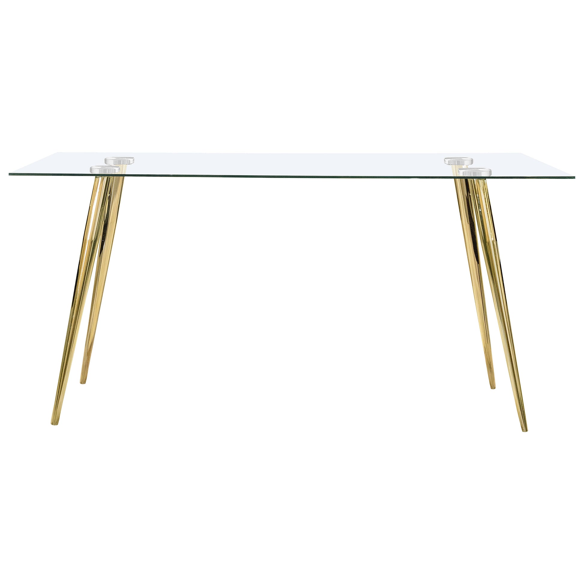 Super stylish with a mid-century modern flair, this dining table is as sleek as they come. Clean lines and an open and airy design offer a transitional twist to this dining table, making it a stunning artistic piece. A rectangular glass tabletop floats elegantly above, supported by flared and tapered legs in a lustrous metal finish add a shimmer to the space. Choose between warm or cool metal tones to tie together your existing decor and complete a space. In addition, this spacious dining table lends itself nicely to contemporary homes.
