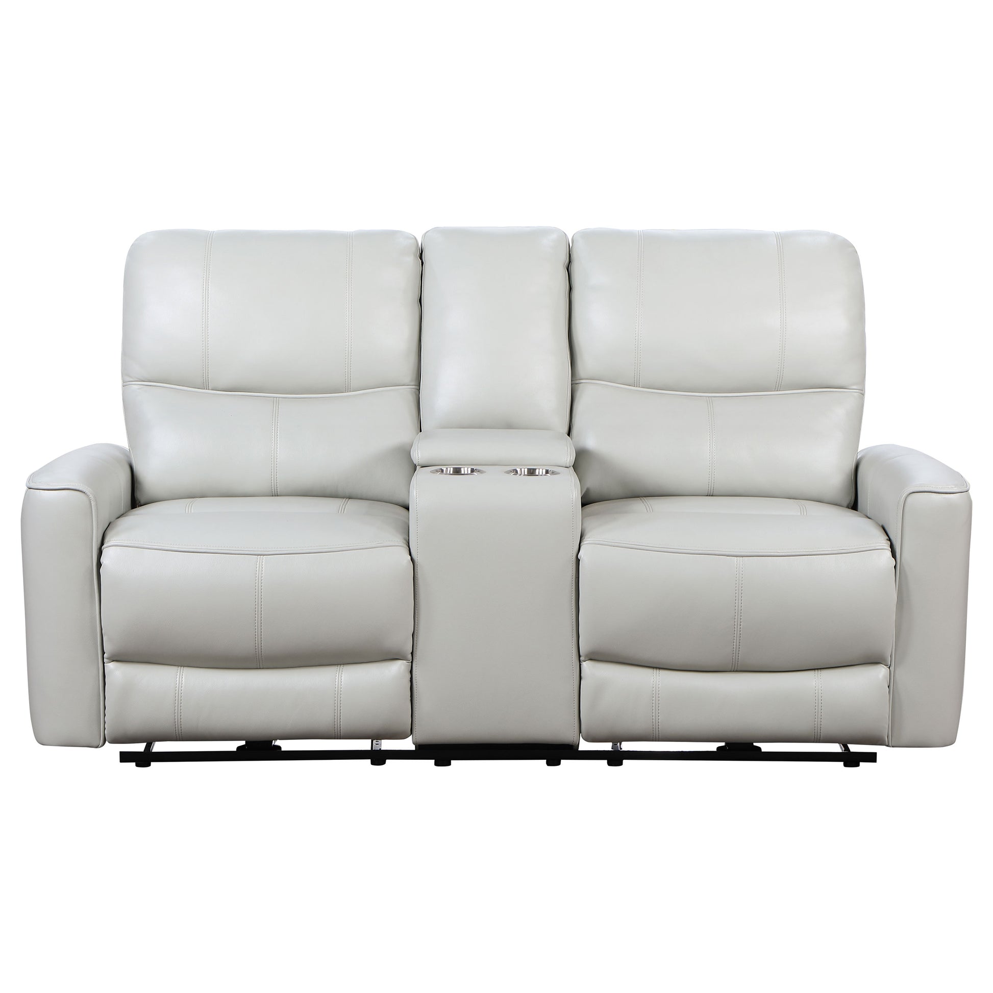 Contemporary elegance plays out in a clean, modern design as the power loveseat delivers beauty and comfort to a space reserved for easy entertaining and relaxing. Dove grey leatherette upholstery covers wood framing to provide a sturdy build, embellished with plump foam filled in tall, attached back cushions and supportive seat cushions. Subtle tufting cradles body positioning, aided in luxurious comfort by power reclining at the touch of a button on a switch panel with a convenient USB port. Store remotes and accessories in a flip-top console and keep beverages handy with dual cup holders. This power loveseat is all that's needed for a relaxing day or evening.