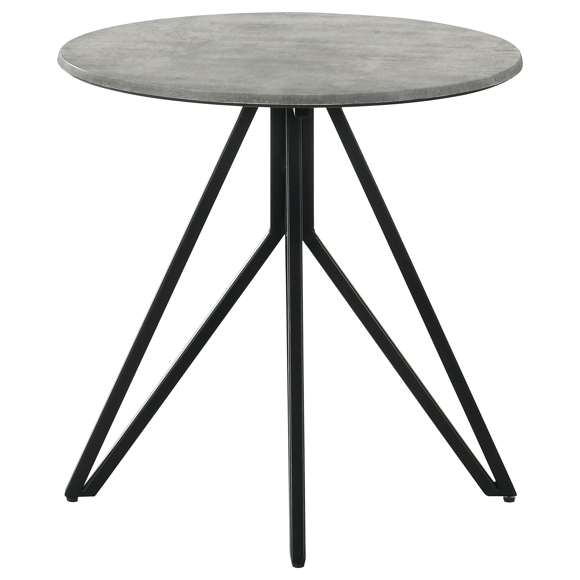 Industrial elements and sleek modern lines bring forth this modern end table. A metal butterfly-like base design of open and flared hairpin style legs in a gunmetal finish offer a striking visual interest to the furniture piece and the room in which is rests. Placed on top of the chic base is a round tabletop that portrays a molded cement for a rustic modern farmhouse flair. The cement-inspired top also offers a textured sandy feel to resemble the true material. Place this modern side table beside an accent chair or allow it to showcase a sculpture or art piece in a loft studio.