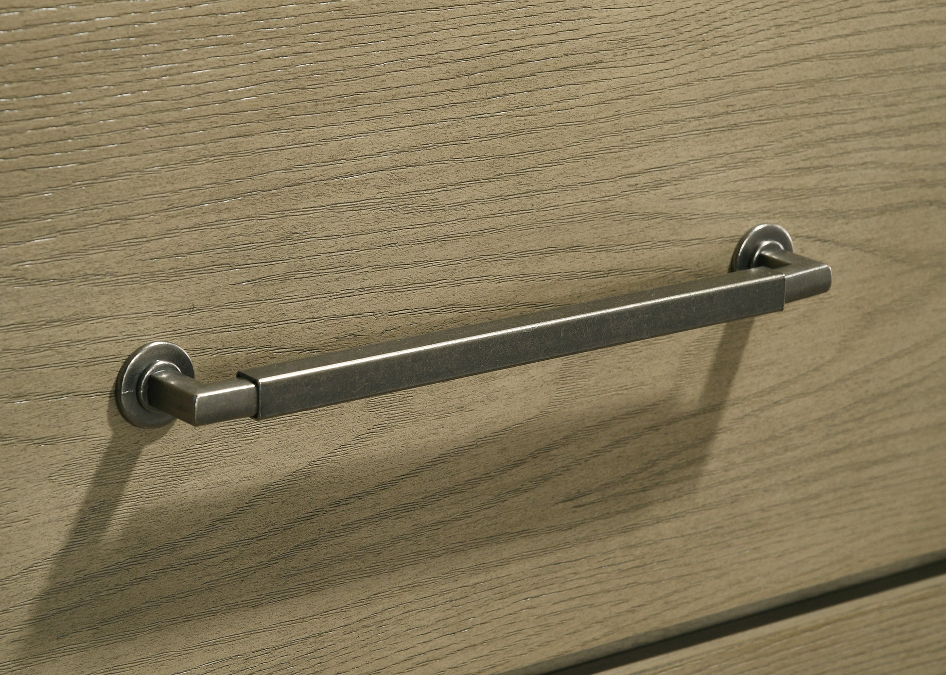 Elevate your space with this bedroom set blending craftsman character and modern utility. A vineyard oak finish enhances the oak grain texture across rubberwood and engineered wood veneer. Antique nickel pull handles lend a refined touch to the clean, framed silhouettes. Case pieces glide with ease on heavy-duty ball bearing glides, while the platform bed features a framed headboard and two footboard drawers. Plywood platform panels offer durable, foundation-free mattress support.