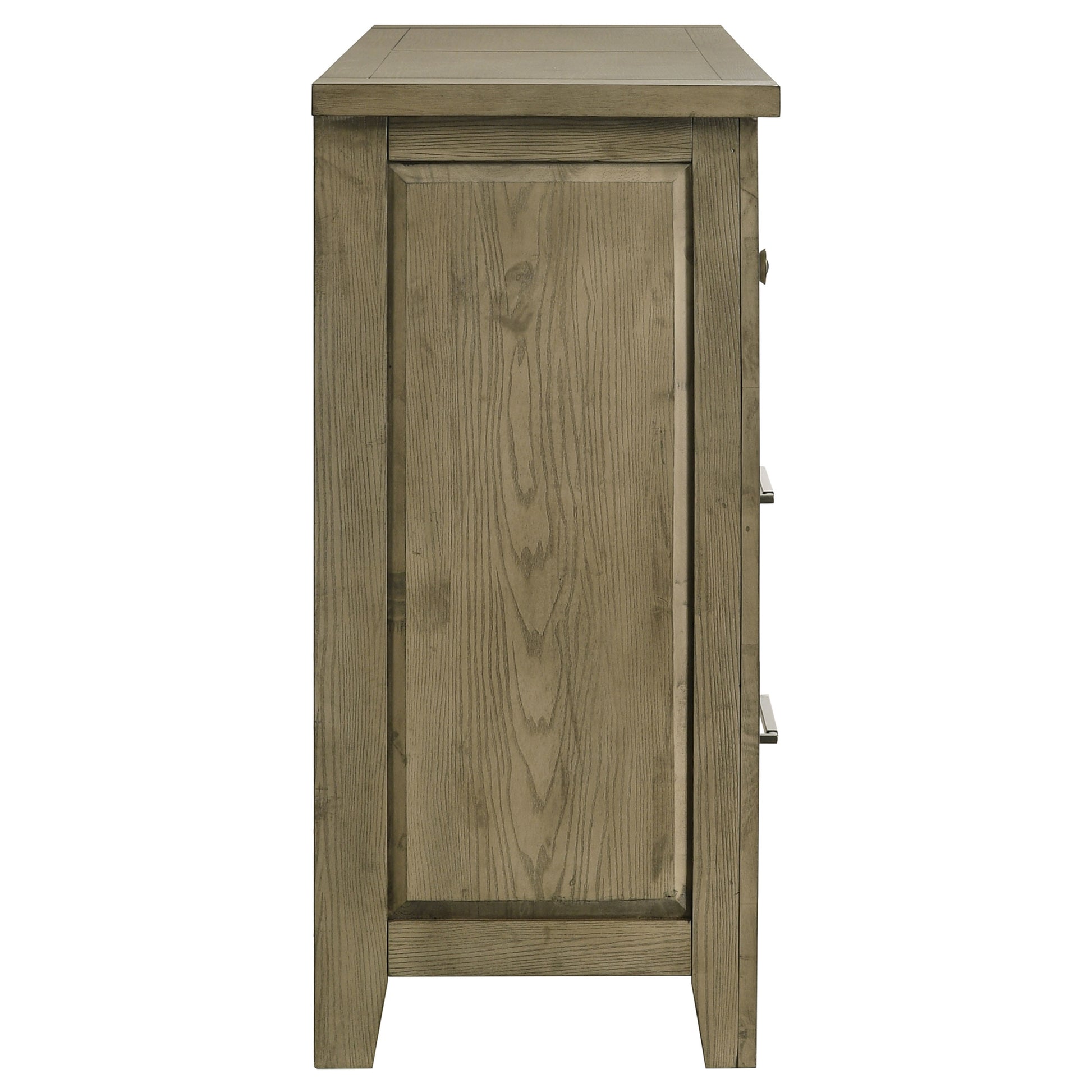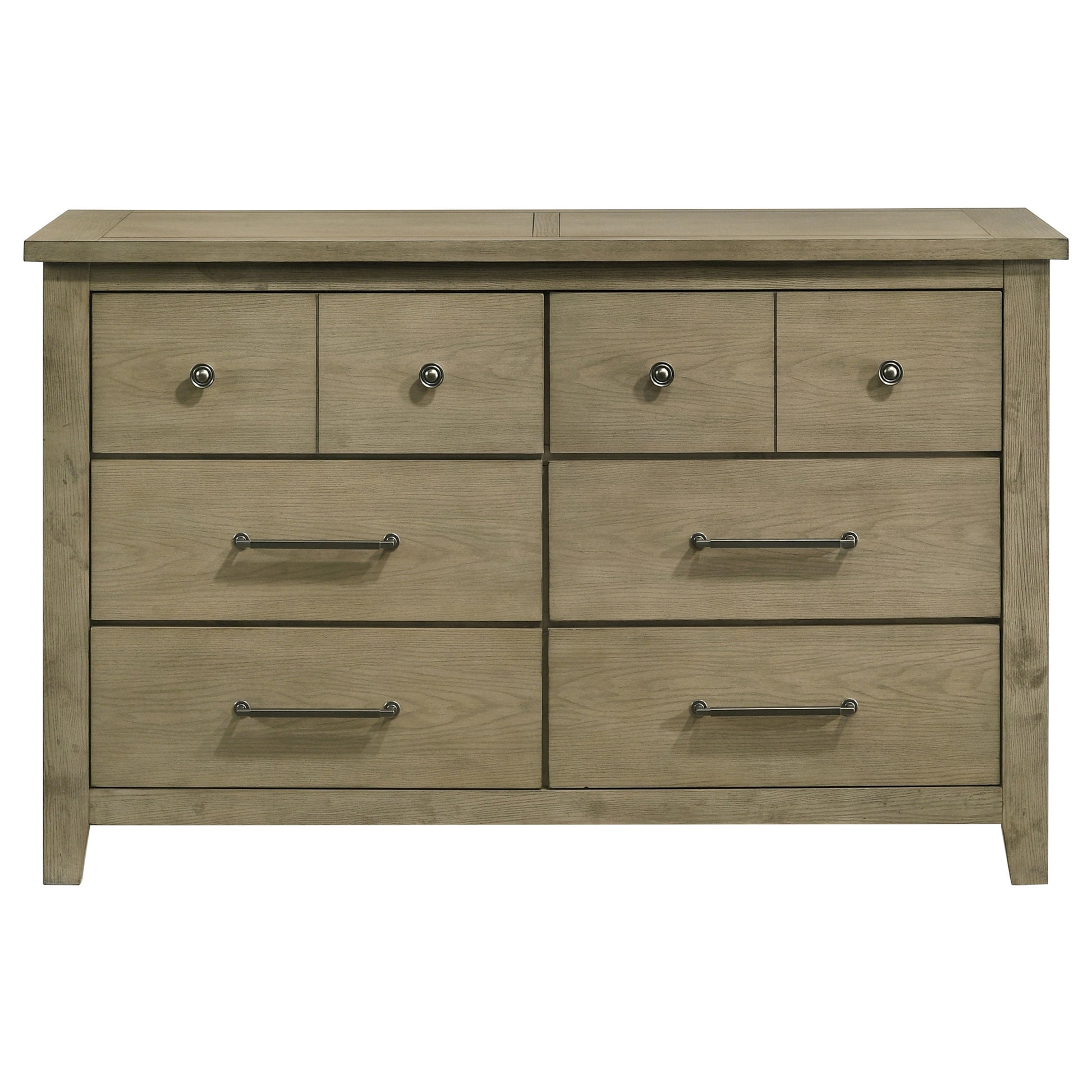 Bring refined rustic warmth to your space with this six-drawer dresser, finished in vineyard oak with embossed oak grain for natural texture. Crafted from solid rubberwood and engineered wood veneer, it balances durability with timeless appeal. Antique nickel pull handles offer a subtle metallic contrast, while heavy-duty ball bearing glides ensure smooth, long-lasting drawer use. The clean silhouette and neutral tone suit a range of transitional and contemporary bedrooms.
