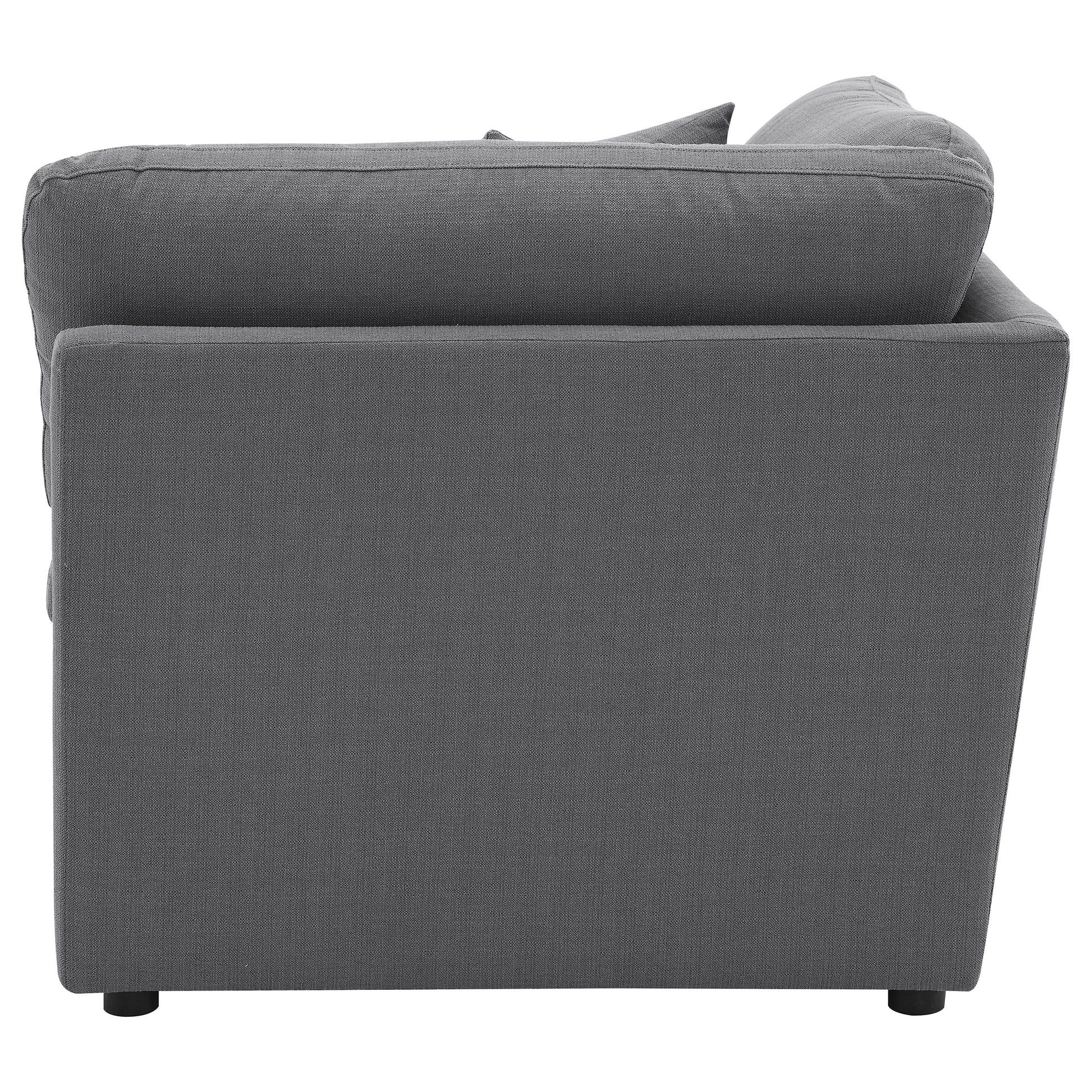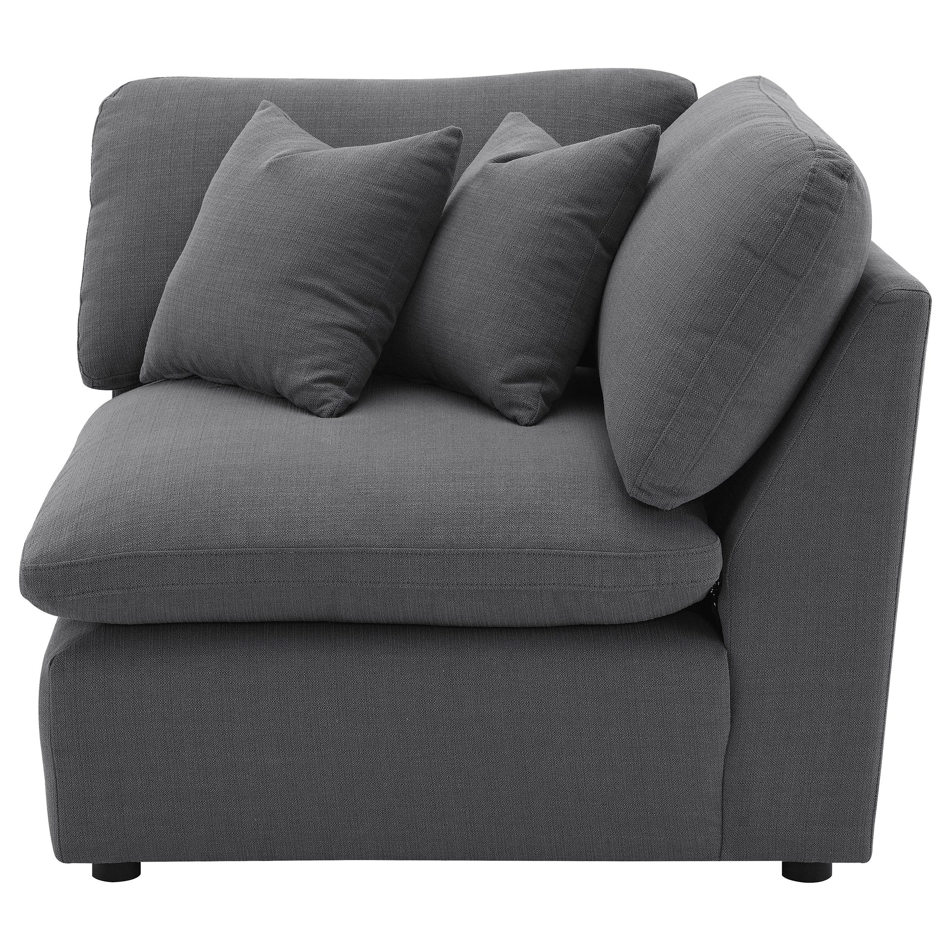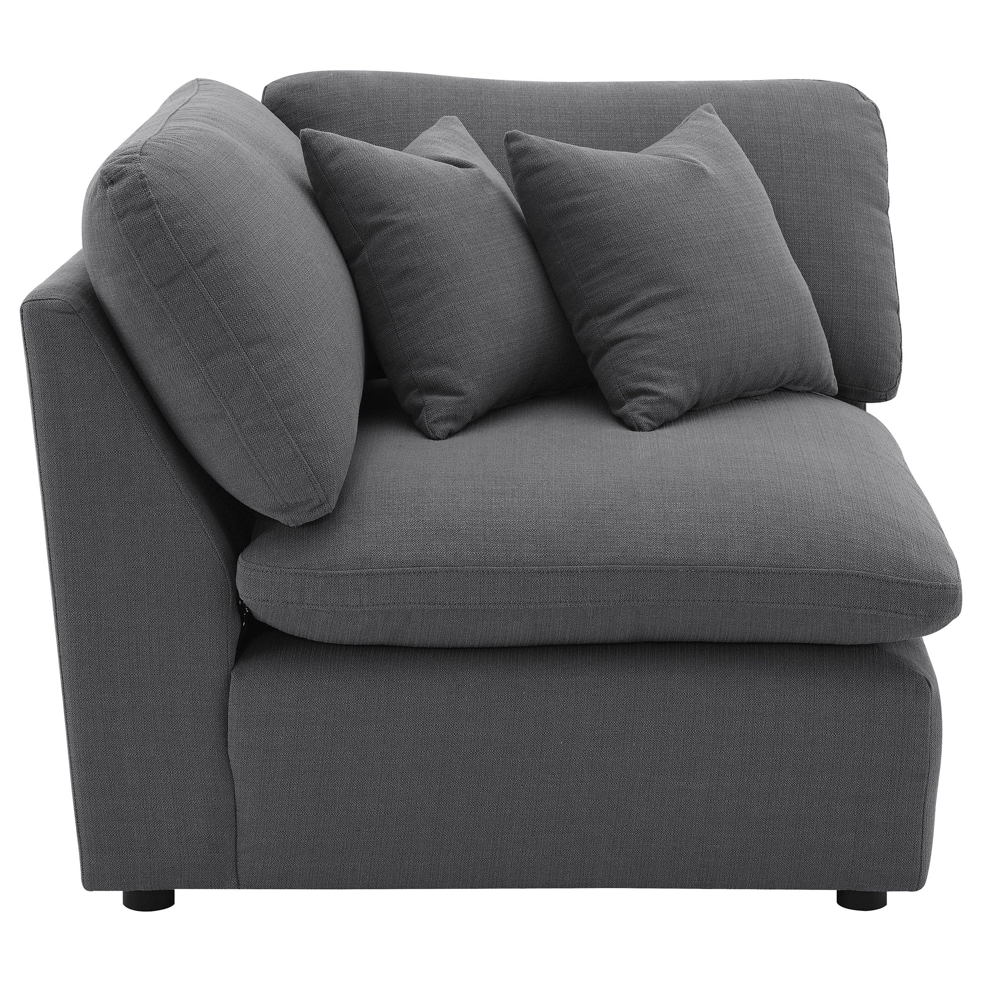 Complete your modular sectional with this versatile corner chair, designed to create a seamless transition between seating pieces. Upholstered in a sophisticated charcoal grey performance fabric, this chair offers plush comfort and a modern aesthetic that enhances any living space. The deep cushions provide ample support, making it a cozy spot to relax and unwind. Perfect as a connecting wedge in your sectional, this corner chair ensures a smooth, cohesive design that maximizes your seating area. Its adaptable style allows it to blend effortlessly into various room configurations, adding both comfort and contemporary flair to your home.