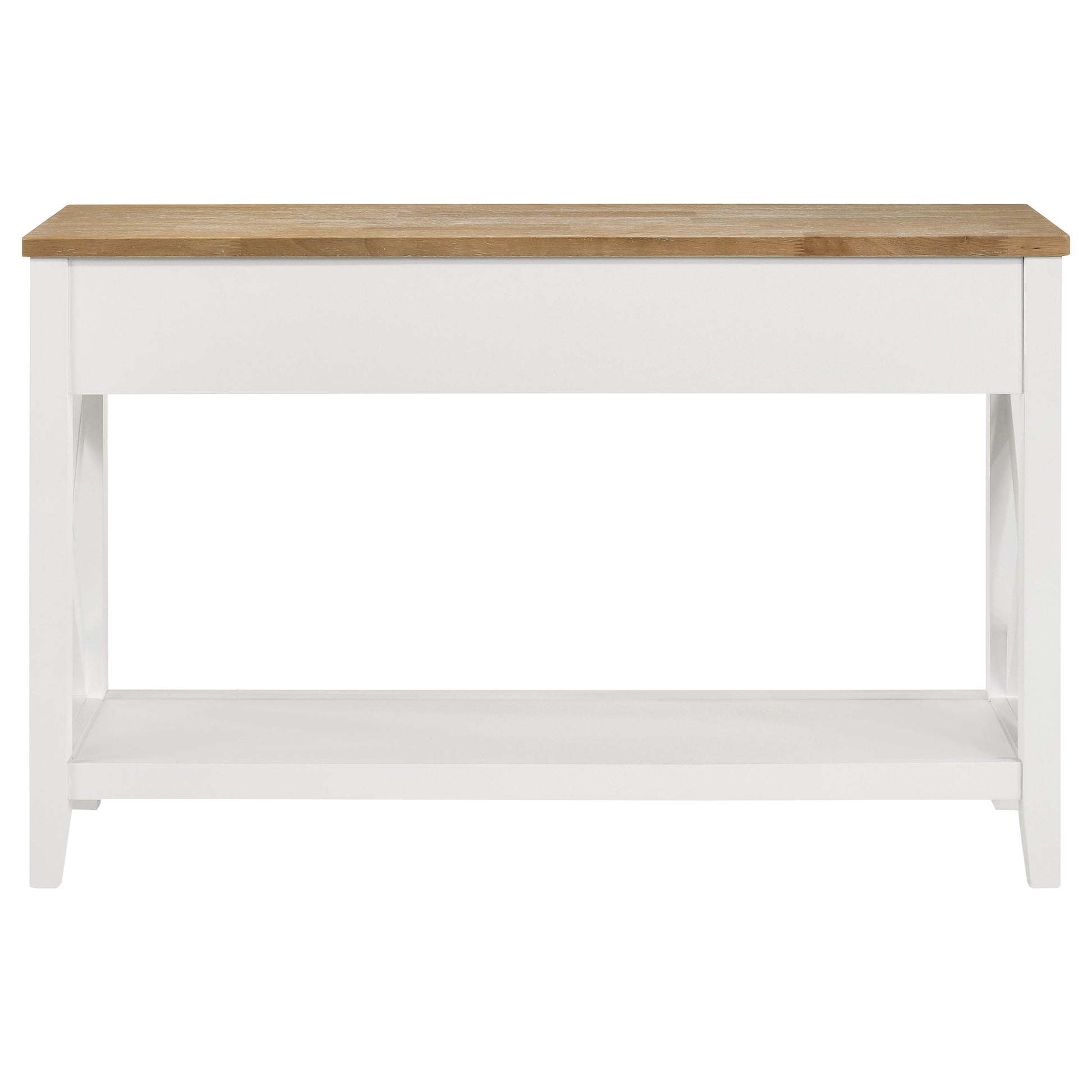 Create a finished look for a floating sofa or add welcoming flair in an entryway with this farmhouse console table. A two-tone design shows off an ash veneer table top with a wire brushed brown finish that assures natural appeal. The table base is done in cool white, offering clean, airy ambiance. Two drawers and an open lower shelf provide plenty of storage and display space, perfect for decor that lends personal touches to your home. Each side of the table adds an X-cross detail that brings farmhouse character and dimension perfect for contemporary casual living.