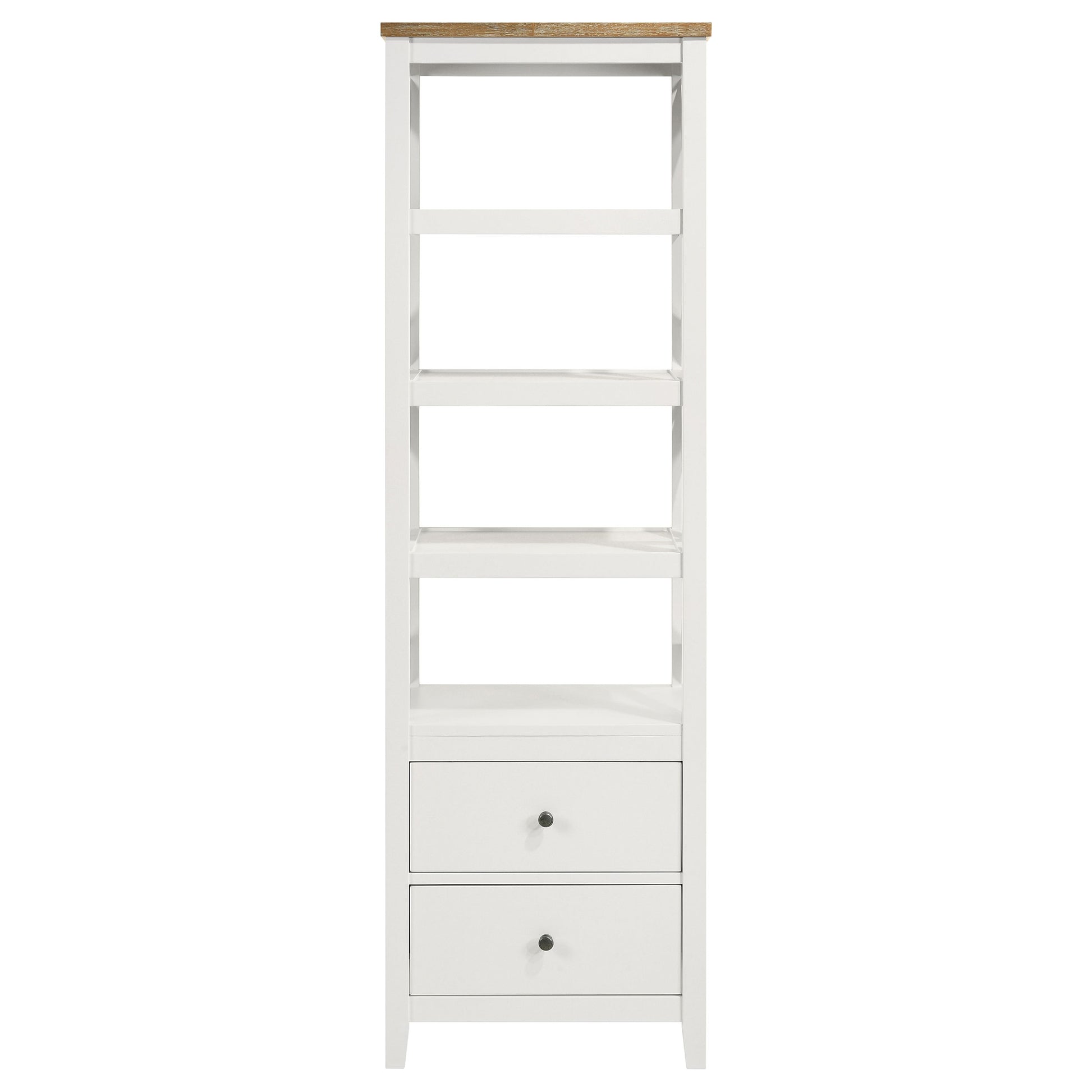 Enhance your TV viewing experience with this versatile entertainment center that combines rustic farmhouse, coastal, and cottage styles. The brown ash veneer top and contrasting white frame with antique silver knobs create a charming look. Ample storage and display space make it practical, while the durable construction ensures longevity. The symmetrical X-trellis media towers on each side add a unique touch of style.