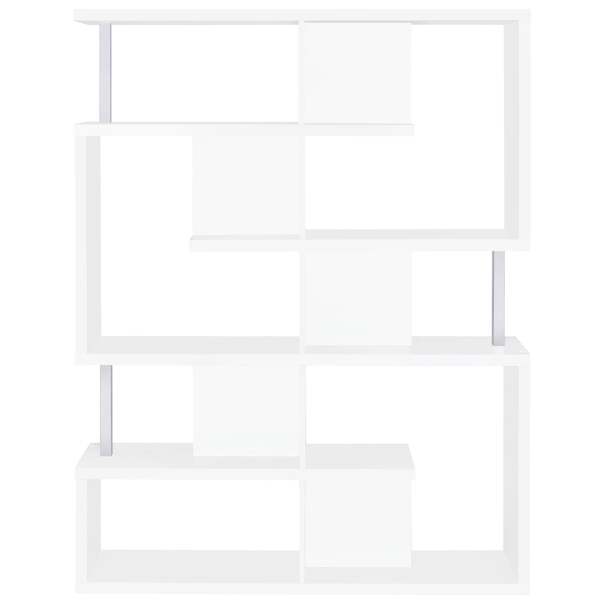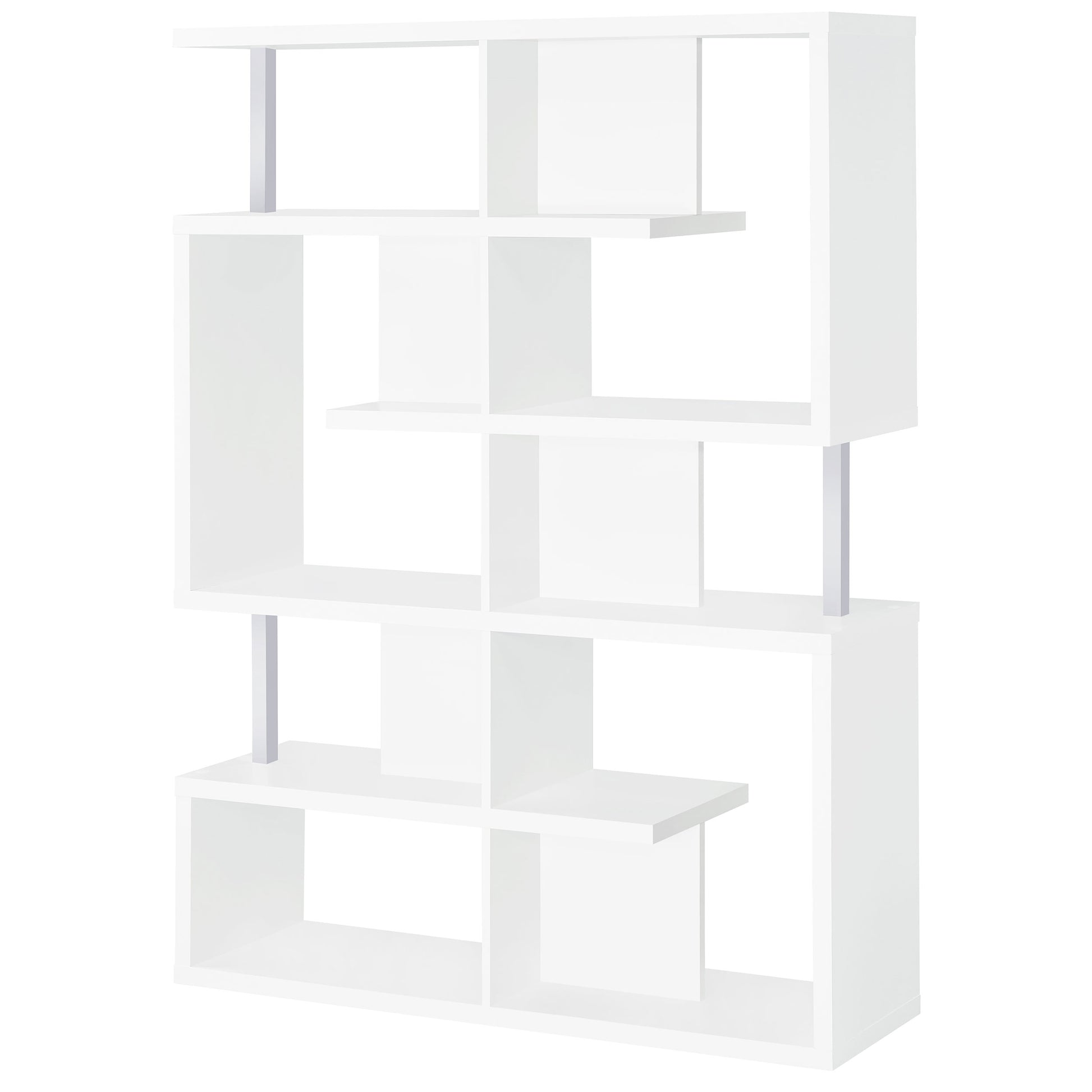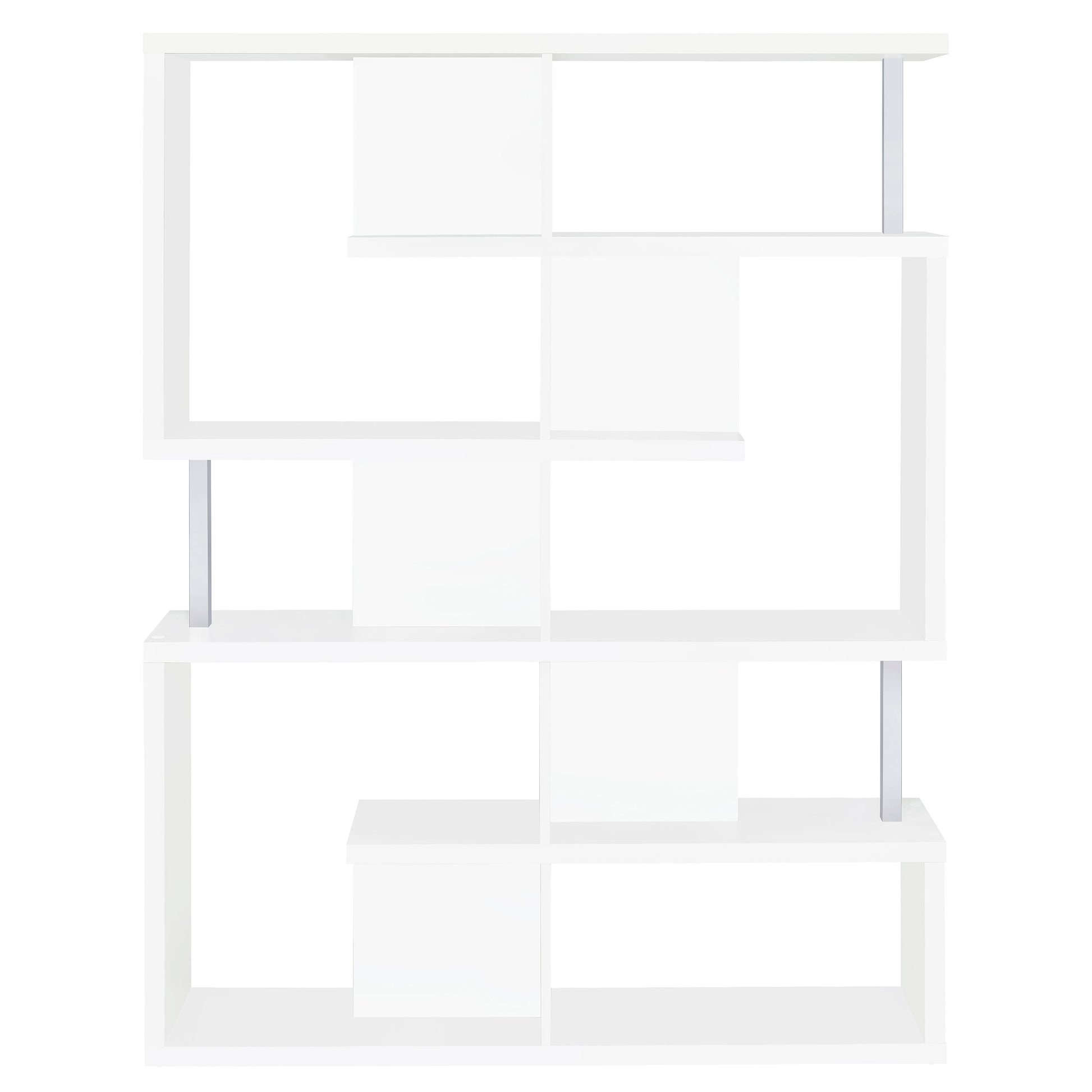 Add an artsy element to a library, living room, or home office. This five-tier double bookcase makes a bold statement with its funky, modern silhouette. Its shelves are arranged in a striking, geometric design for an updated look. This bookcase is crafted from steel, particle board, and engineered veneer for sturdy durability. Whether you choose a black or white finish, its gleaming chrome details pull it together in style.