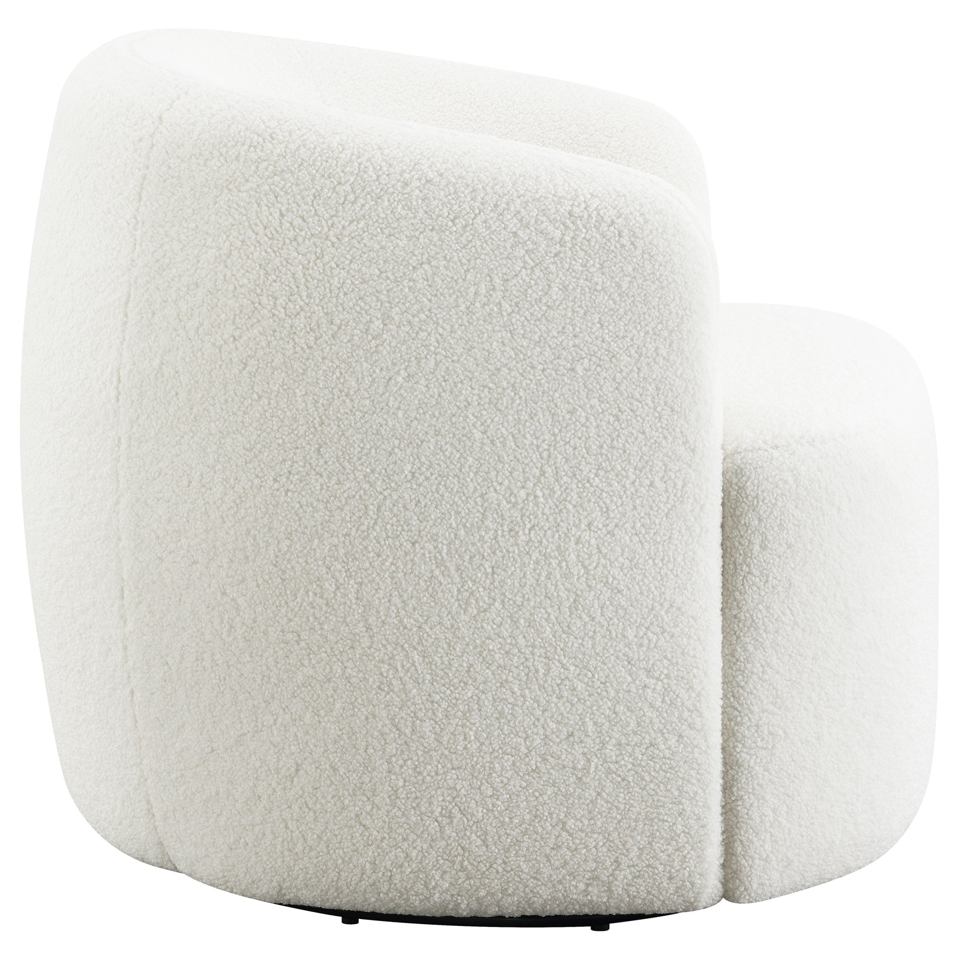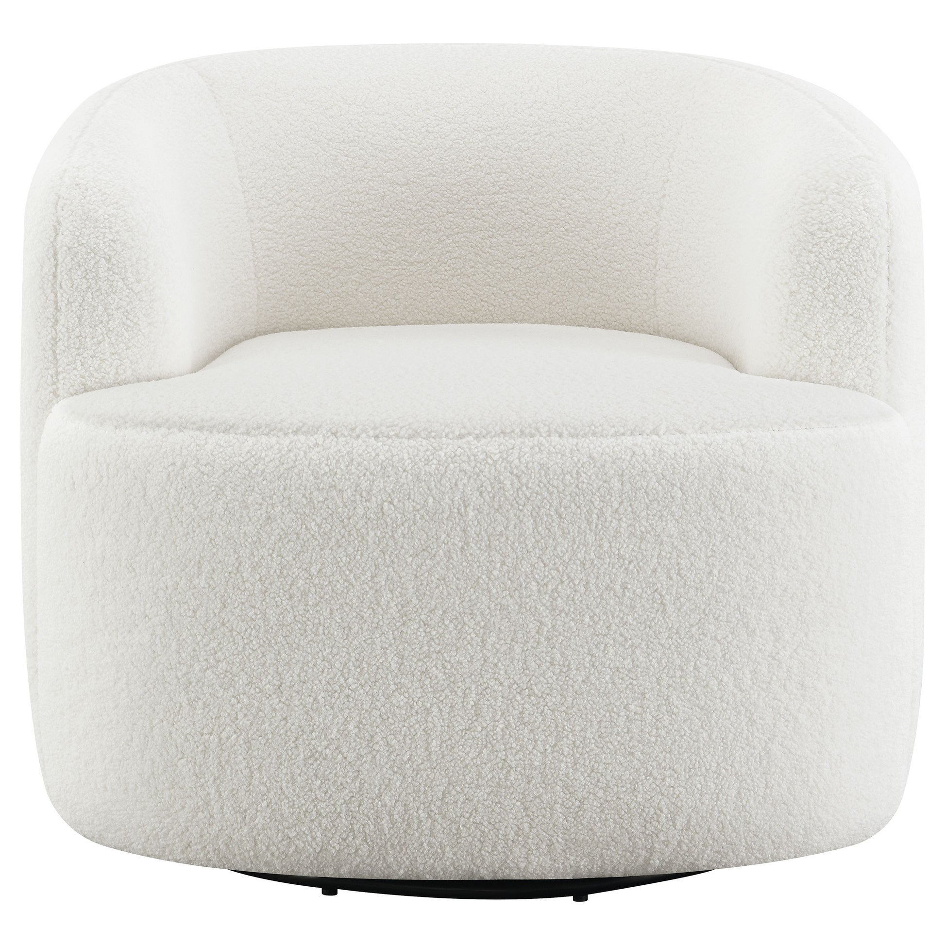 Covered entirely in a plush faux sheepskin material, this swivel chair invites you to curl up and relax. Rotating a full 360 degrees, this accent chair is perfect for open floor plans and versatile spaces. The vintage-inspired barrel-like design offers ultimate support with a tailored, tight seat and a rounded, low-profile backrest that wraps into the arms toward a slight taper. A flush base keeps the swivel mechanism discreetly hidden and offers a sleek profile. The light hue of the faux sheepskin also makes this furniture piece easy to coordinate within a space.