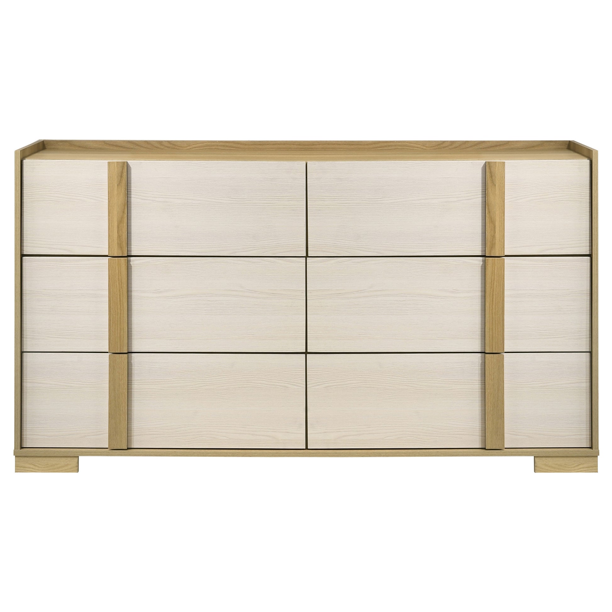 Enhance your bedroom with the contemporary elegance of this six-drawer dresser. Inspired by modern Italian design, it features a sophisticated blend of natural wood tones and white panels crafted from durable, easy-care melamine. The drawers, equipped with metal extension glides and pin-construction joinery, offer smooth operation and ample storage for your clothing and accessories. The vertical lines of the natural finish hardware add a touch of sleek sophistication, perfectly complementing the dresser's clean lines and modern aesthetic. This dresser is not just a storage solution but a stylish focal point that elevates your home decor.