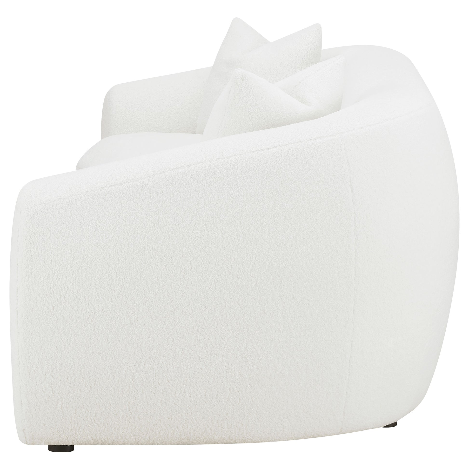 Create your inviting living room with this contemporary natural sofa, upholstered in boucle upholstery throughout its gracefully designed, contoured silhouette and elegantly sloped armrests. Matching accent pillows with premium faux down fill offer extra coziness and comfort to the curved bench cushion and tailored backrest.