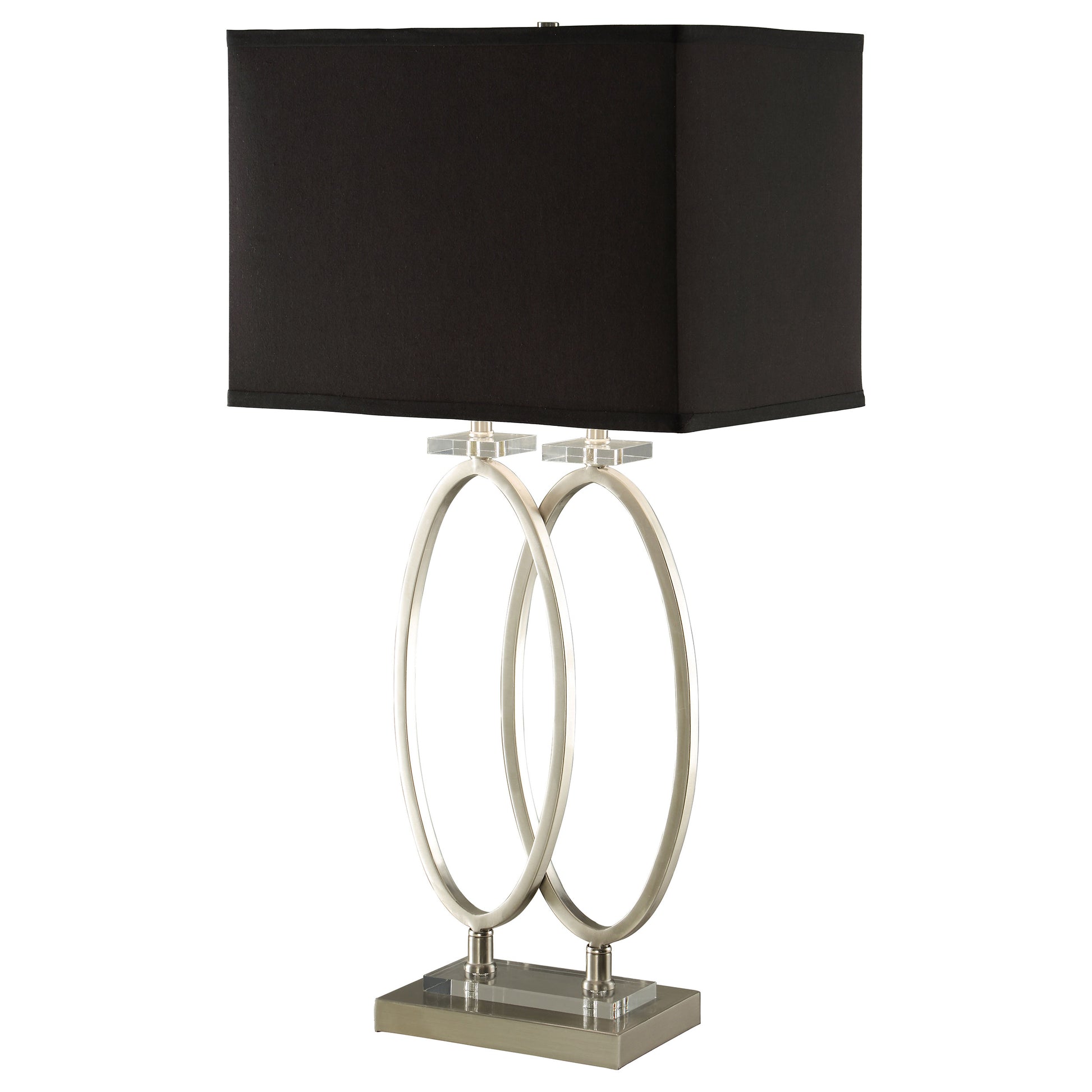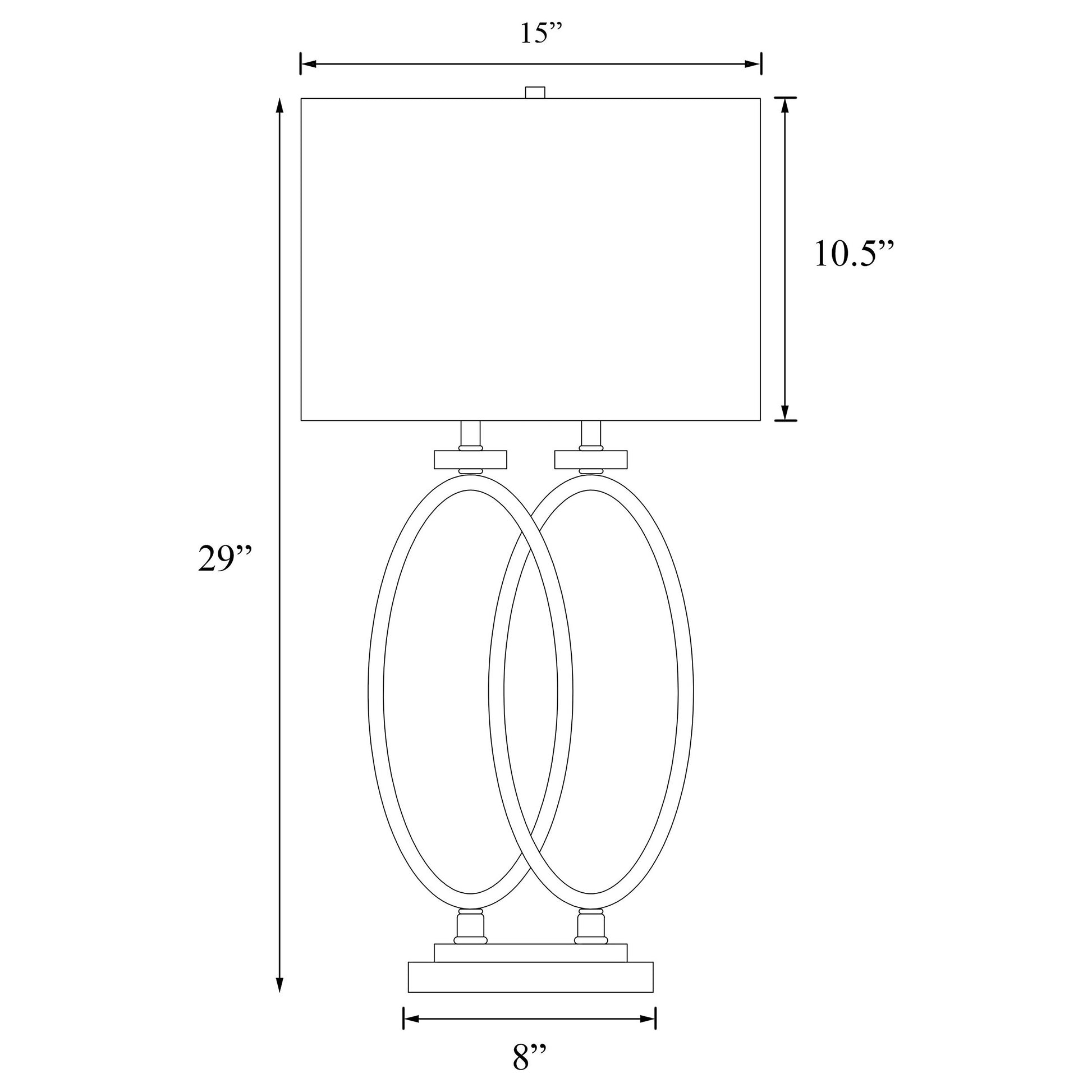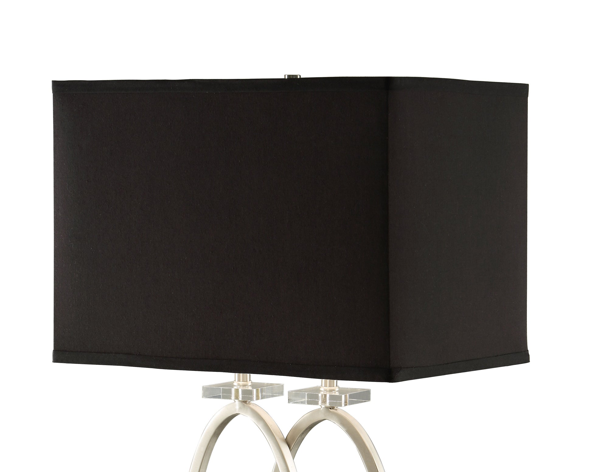 This modern table lamp features a pair of brushed nickel oval rings that float within a crystal-clear base, bringing sculptural balance to any space. Its rectangular fabric shade adds contrast and definition, while the sleek silhouette complements a wide range of contemporary or transitional interiors. Designed for both style and function, this striking accent lamp elevates your living room, bedroom, or home office with a polished presence.