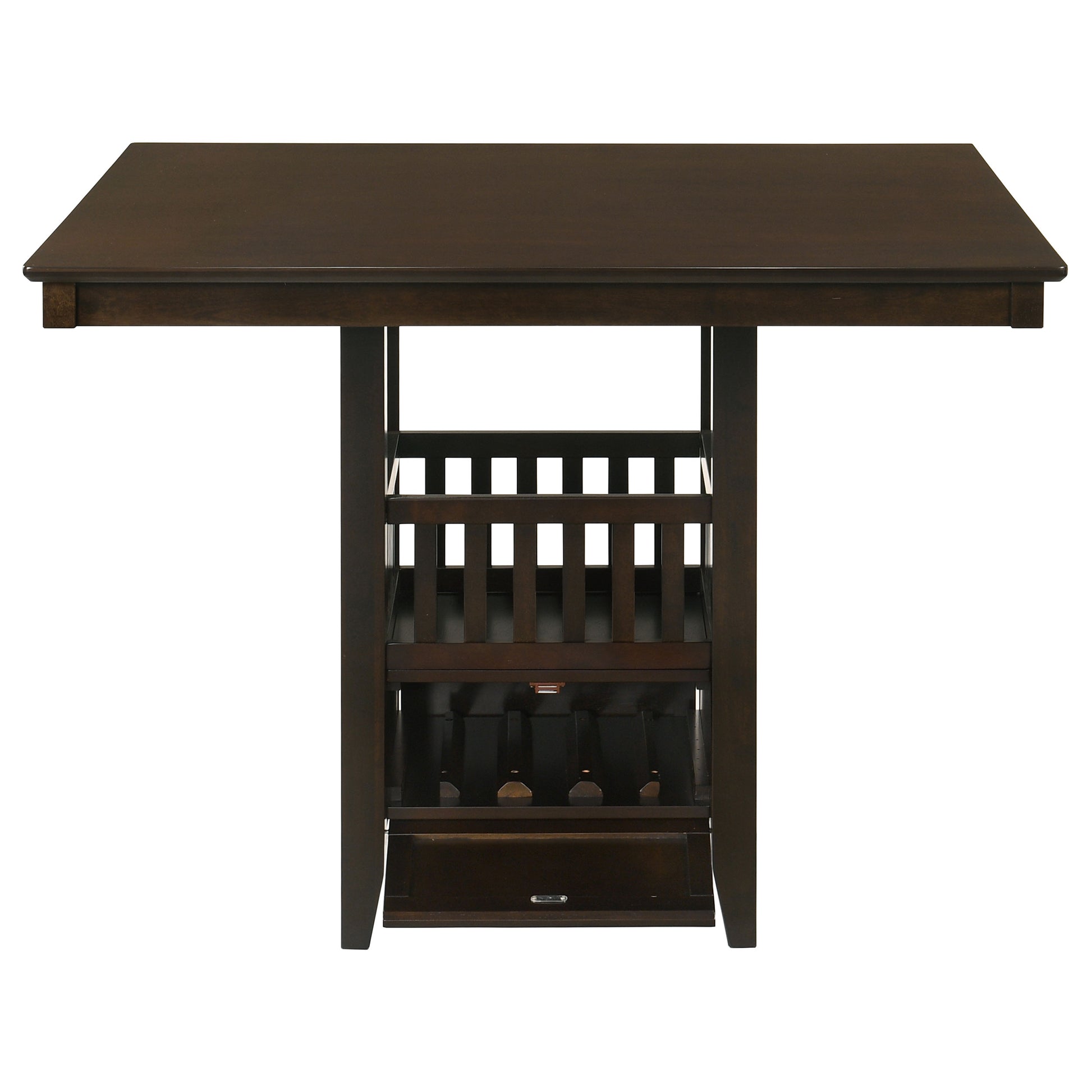 Gather your loved ones around this sleek, chic table for a remarkable dining experience. Its simple silhouette is enhanced by an eye-catching, slatted wood design. A center cabinet with a built-in wine glass holder offers ample storage space. With a classic finish of rich cappuccino, its gorgeous design is pulled together with a striking element of glamour and class. This exquisite, counter-height table is perfectly sized to accommodate an elaborate meal without taking up too much space.