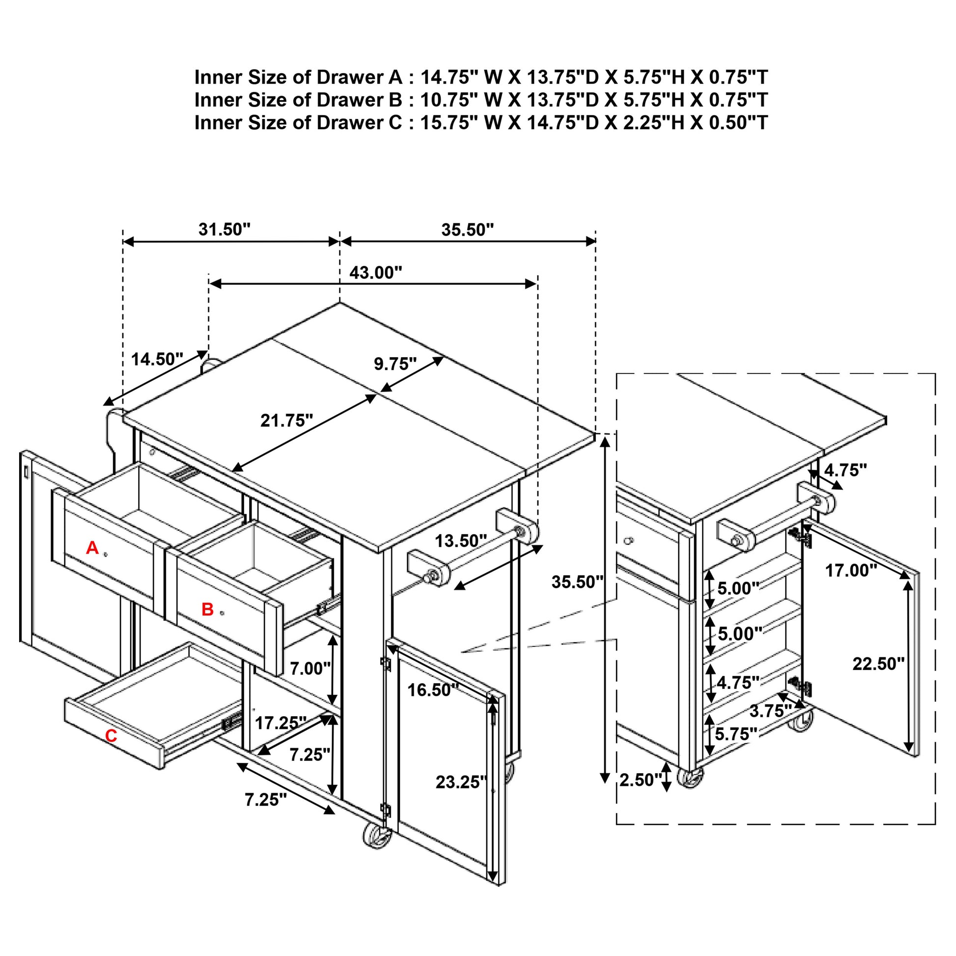 | Kitchen Cart | 43 | 31.5 | 35.5 | 121.28 |