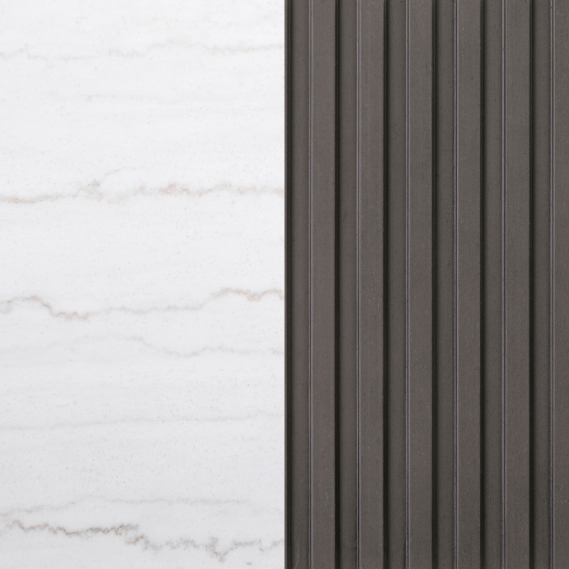 Center your living space with this elegant, modern round coffee table. The genuine white marble top exudes sophistication with its subtle veining, adding organic flair. The clean, light coloration complements any surrounding decor. A ribbed, engineered wood frame in a charcoal finish creates texture and depth, while the brushed gold metal base brings a luxurious touch. This piece seamlessly blends refined materials and design, making it the perfect addition to your living room.