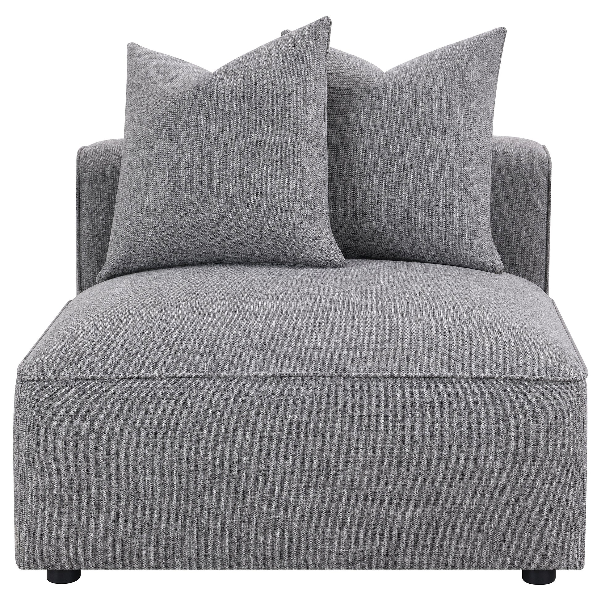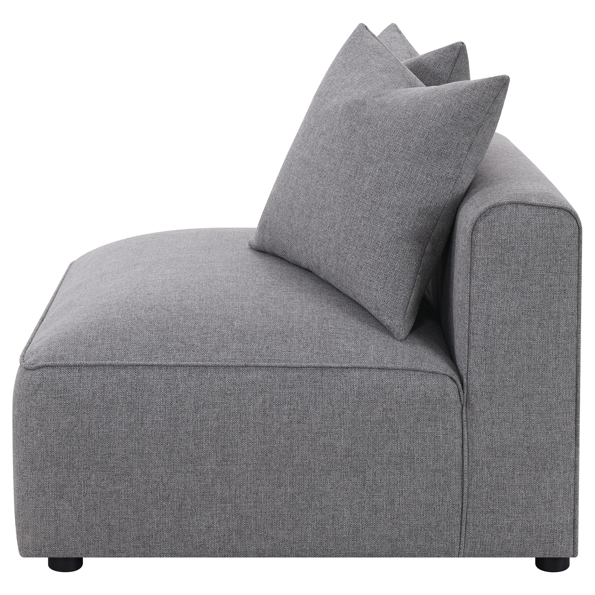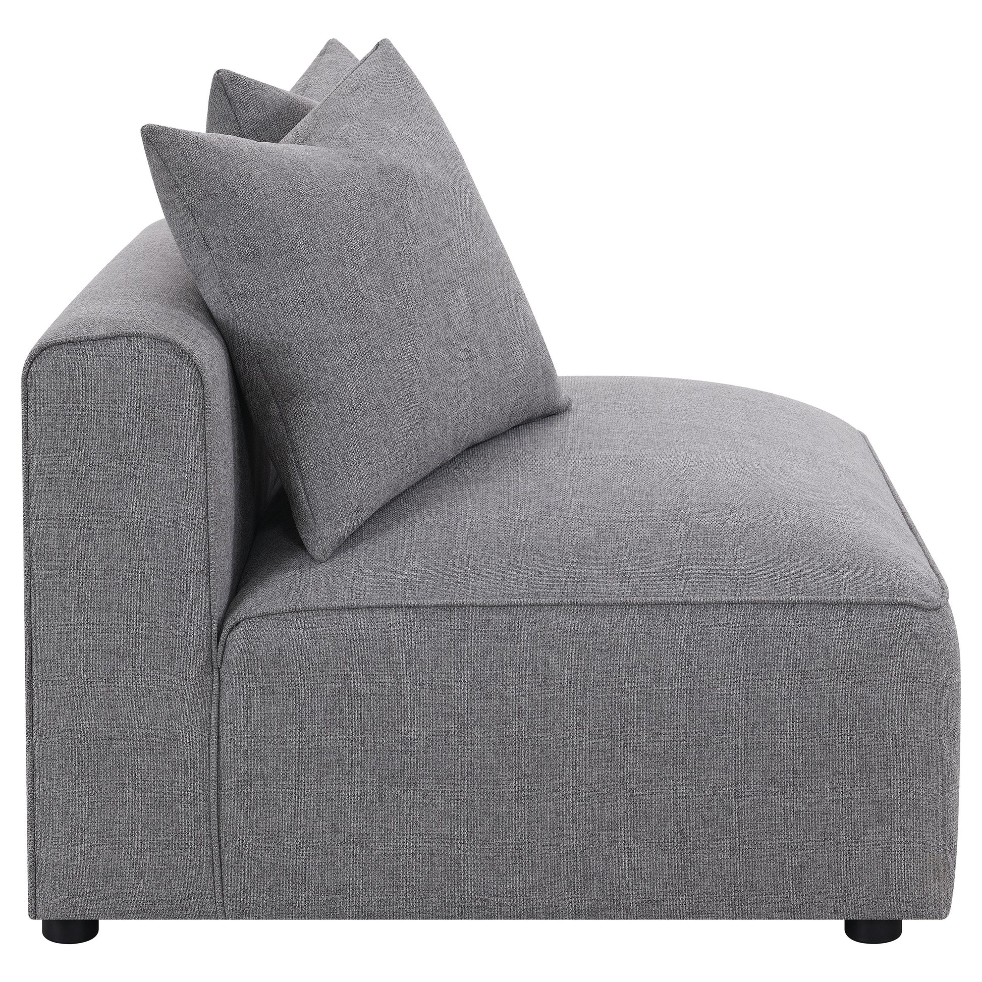 Customize your sectional sofa and slip in this contemporary modular armless chair. A perfect addition to extend your seating capabilities in a living room or entertainment area, this modular chair is as versatile as they come. A neutral color palette presented in the soft grey woven fabric makes it easy to unify your whole look. A low-profile tight seat with matching pillows offers a plush place to lean back and relax. Seamless black legs offer a discreet elevation as welt trim defines the edges.
