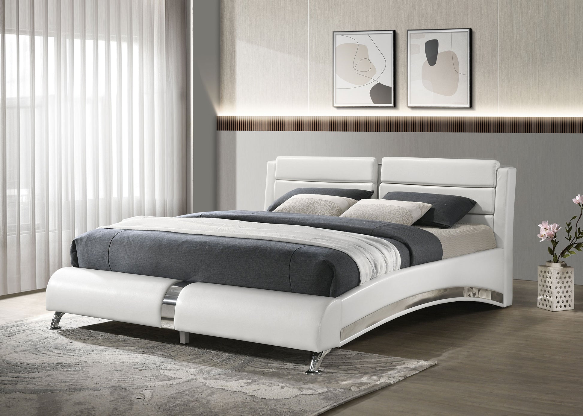 The Jeremaine collection presents this well-designed bed with a touch of class. It features straight lines and sumptuous curves for a contemporary allure. The headboard is fashioned with cushioned paneling for a unique look. The bed is stunningly finished in coated polyurethane that's polished to a high gloss. The chrome-like accents give this bed an exquisite appeal fit for any modern bedroom.