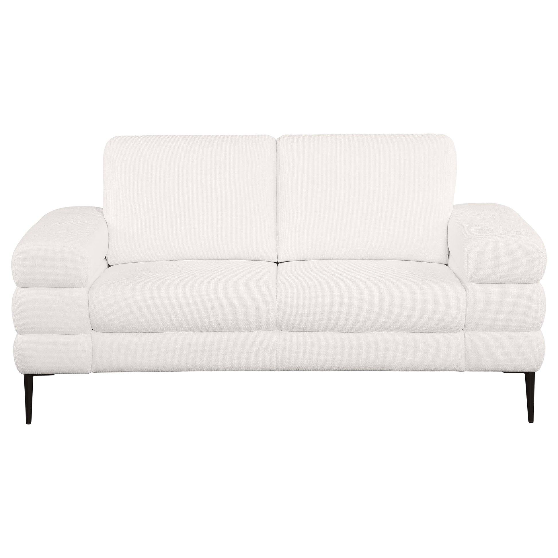 Elevate your living space with the complete modern sophistication of this sofa, loveseat, and chair set. Each piece features tube-like geometric sculptured track arms, offering a unique and stylish design that sets this set apart. Wrapped in beautiful ivory chenille basket weave fabric, the set exudes elegance and provides an inviting seating experience. Supportive reversible back cushions ensure comfort and can be easily flipped for even wear and extended use. Thin metal legs add to the modern appeal, creating a light and airy look while providing a sturdy foundation.