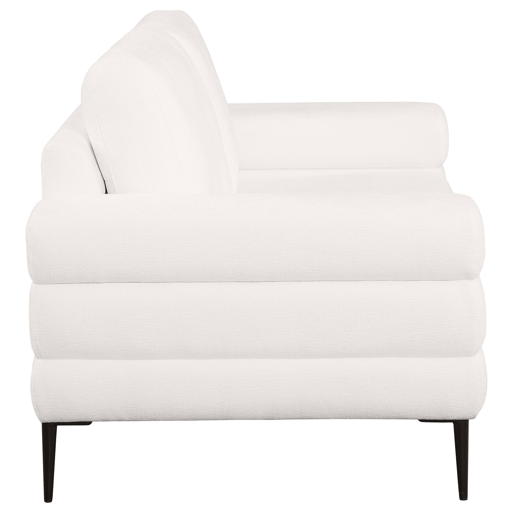 Infuse your living space with modern sophistication with this elegant ivory loveseat. Featuring tube-like geometric sculptured track arms, this loveseat stands out with its unique and stylish design. The beautiful ivory chenille basket weave fabric offers a visually appealing and incredibly soft seating experience. Designed for comfort, the loveseat includes supportive reversible back cushions that provide excellent support and can be easily flipped for even wear. Thin metal legs complete the modern look, adding a light and airy touch while ensuring stability.