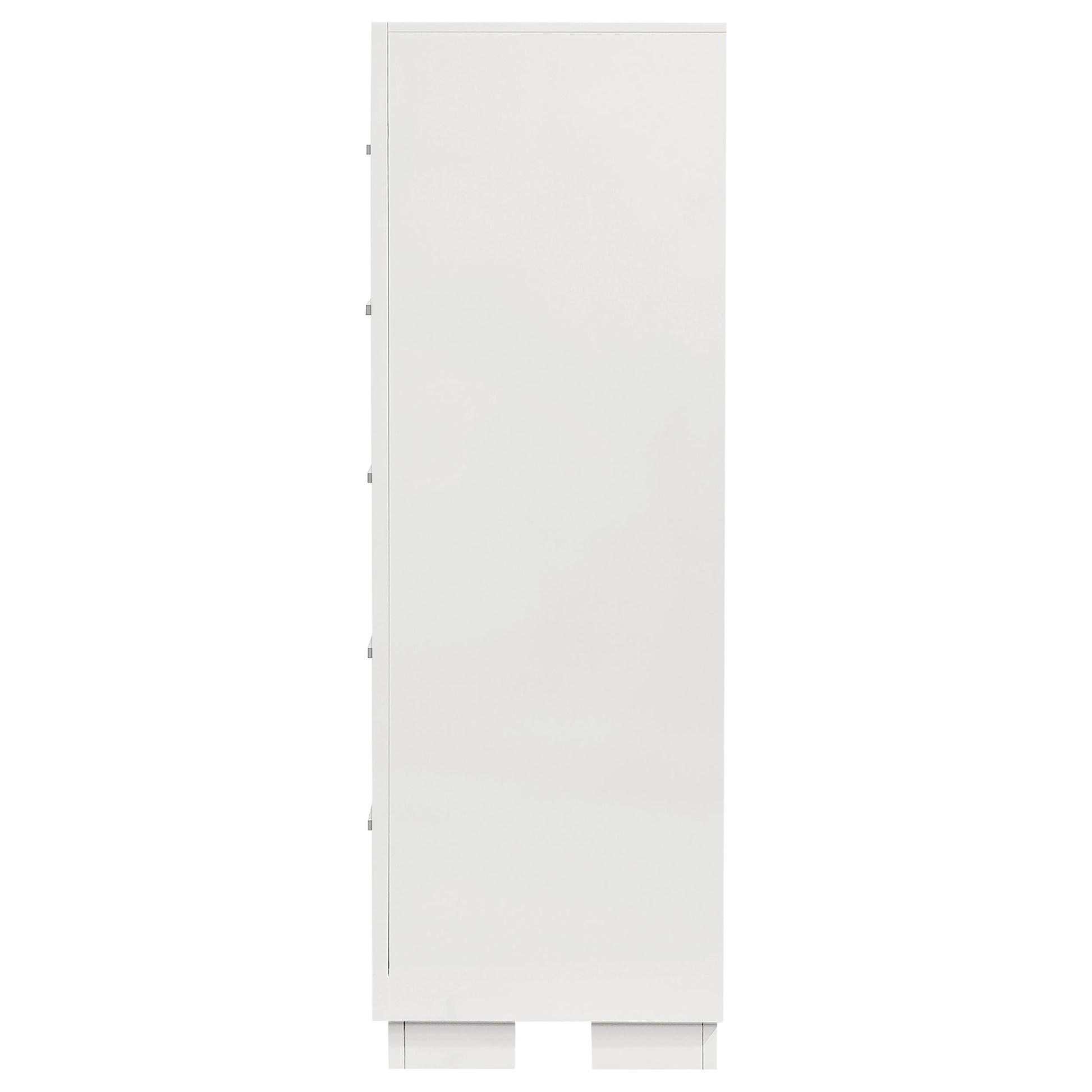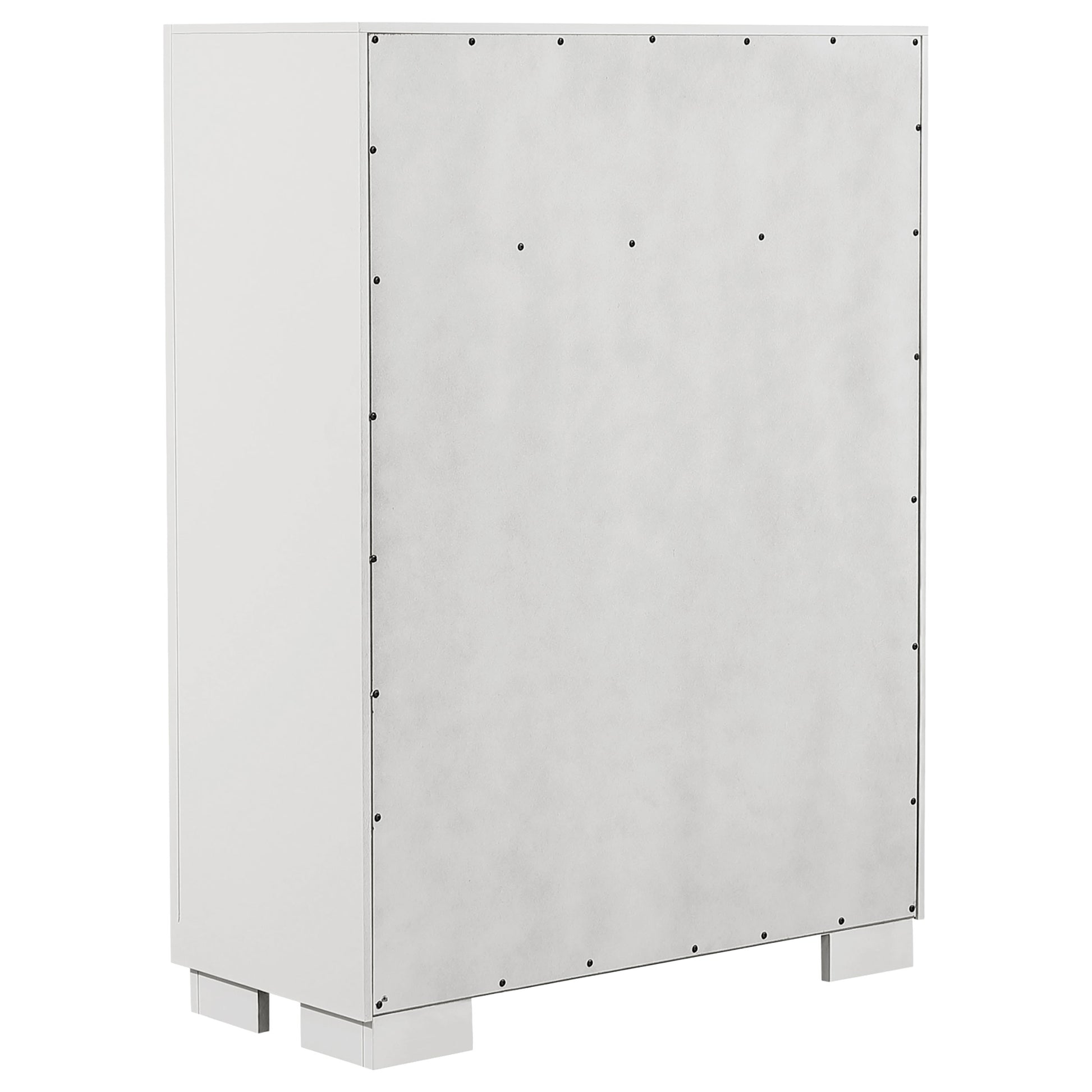 Pull together your bedroom decor with the stylish simplicity of this six-drawer chest. Bold and modern, its attractive design lends a pleasing touch of contemporary appeal. Its six sizable drawers allow for spacious storage to help you stay organized. Its soft, snow white finish and simple silver tone bar handles infuse it with elegant simplicity. Crafted from solid wood, this table enhances any bedroom with sturdy, durable glamour.